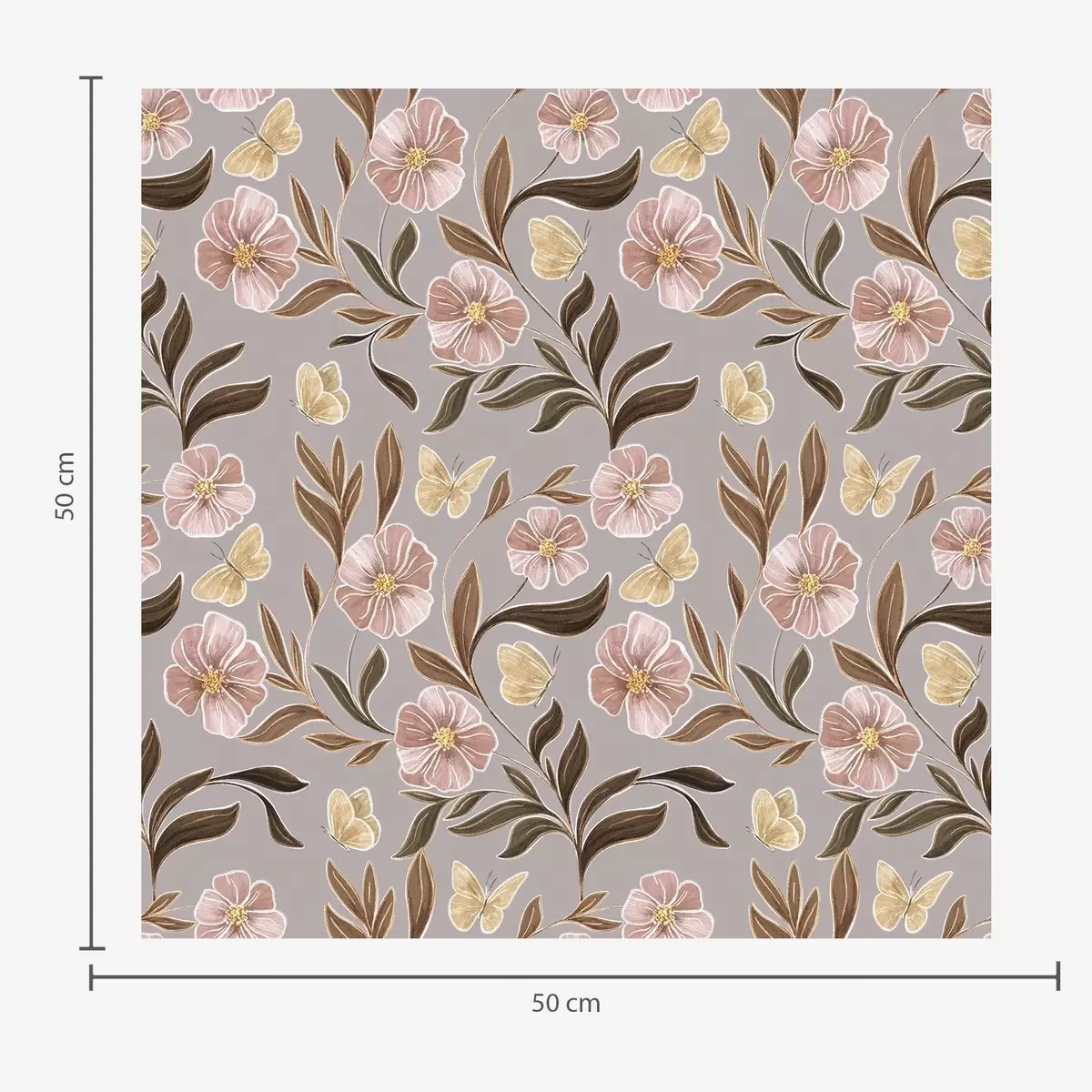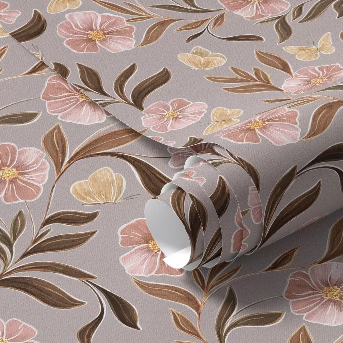 Carta da parati Fiori rosa e farfalle su sfondo grigio-beige Nr. a00633