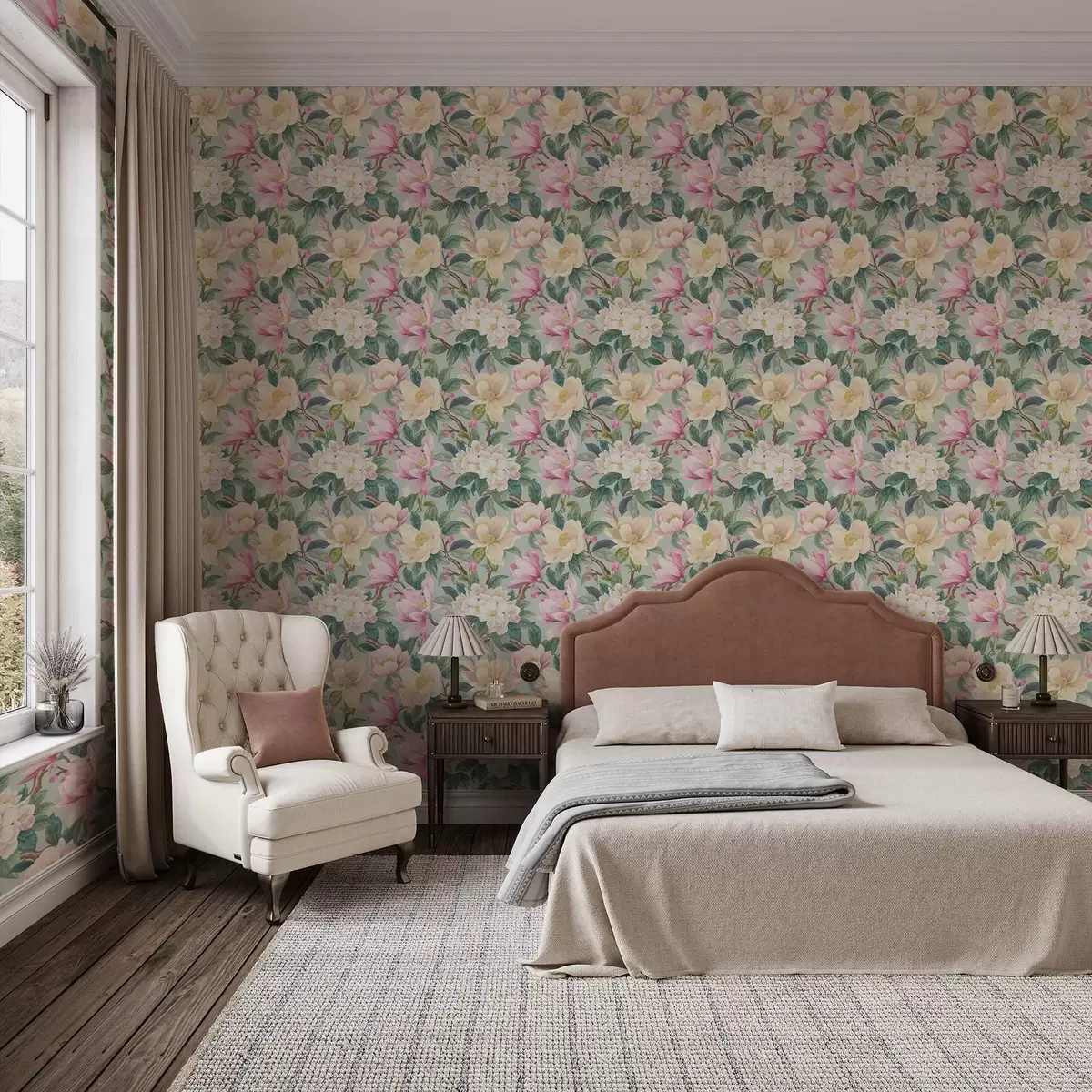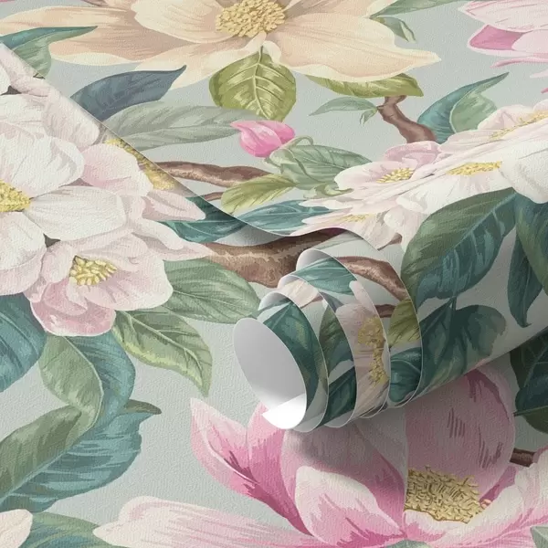 Carta da parati Magnolie e fiori bianchi su sfondo grigio menta Nr. a00644
