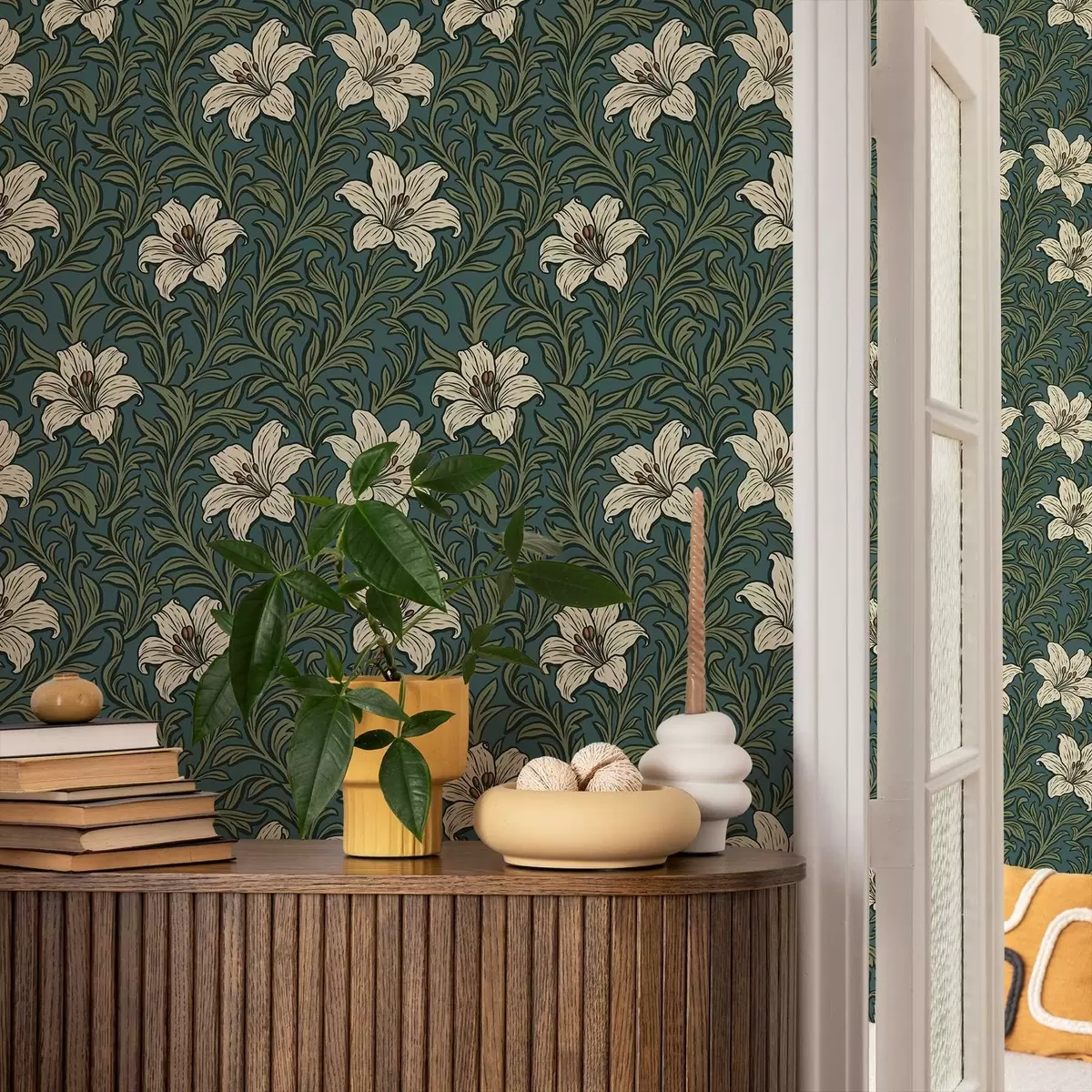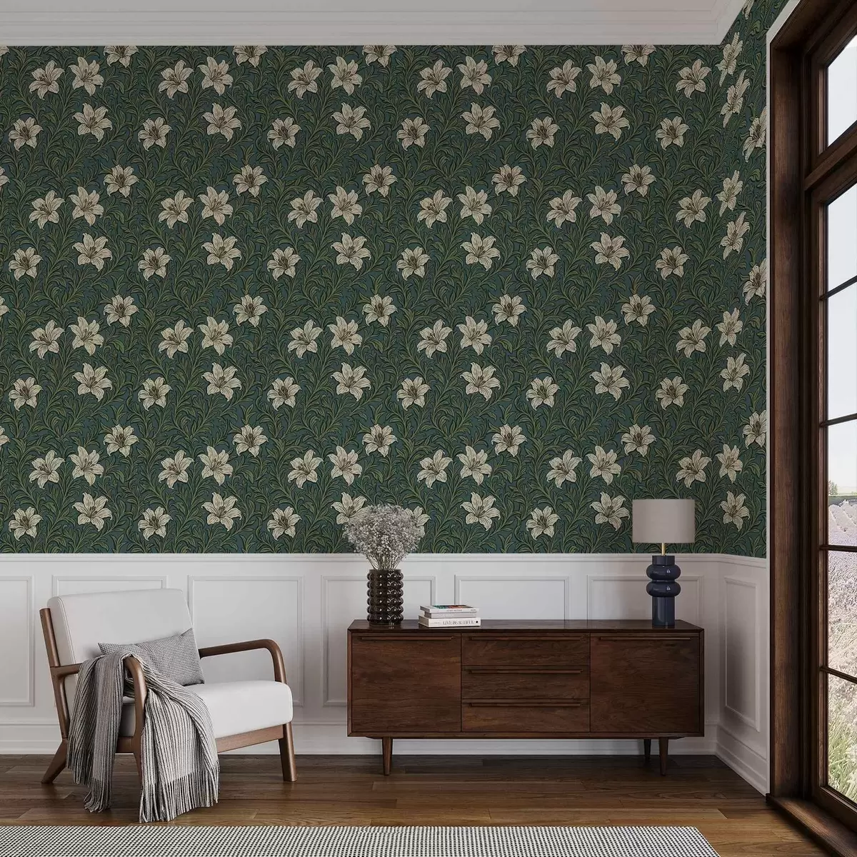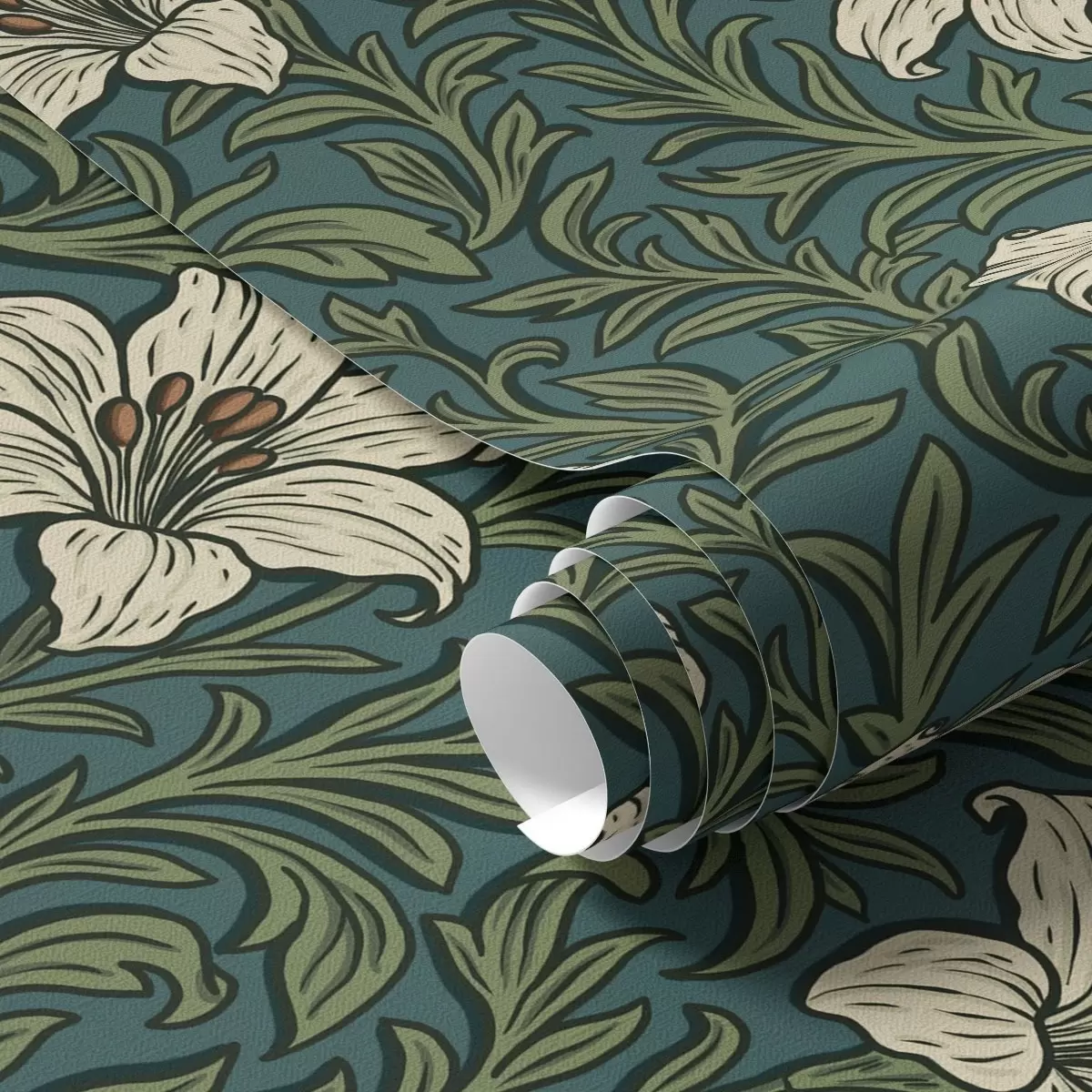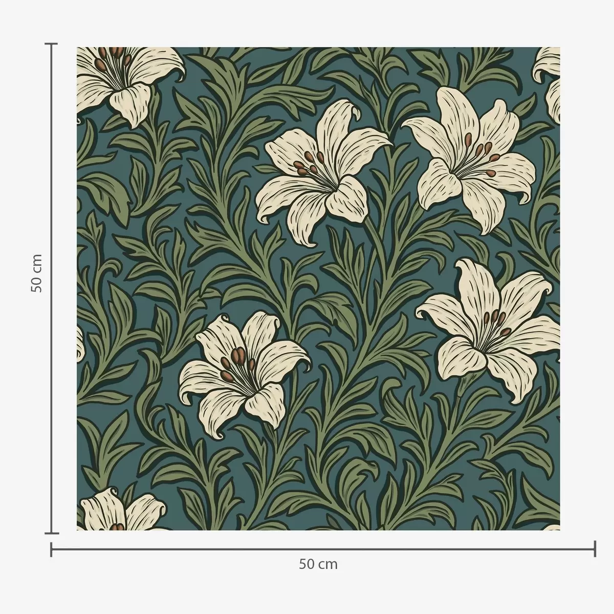 Carta da parati Gigli color crema tra una fitta vegetazione su sfondo turchese Nr. a00645