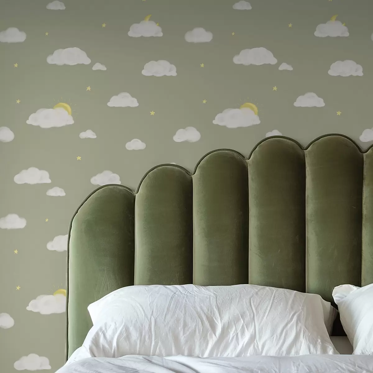 Carta da parati Nuvole morbide, stelle e sole su uno sfondo grigio-verdastro Nr. a00652v1