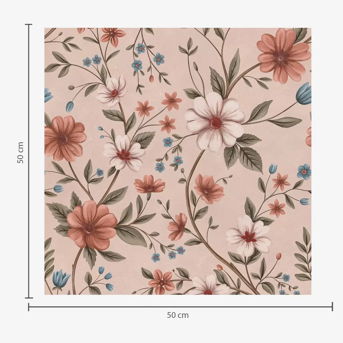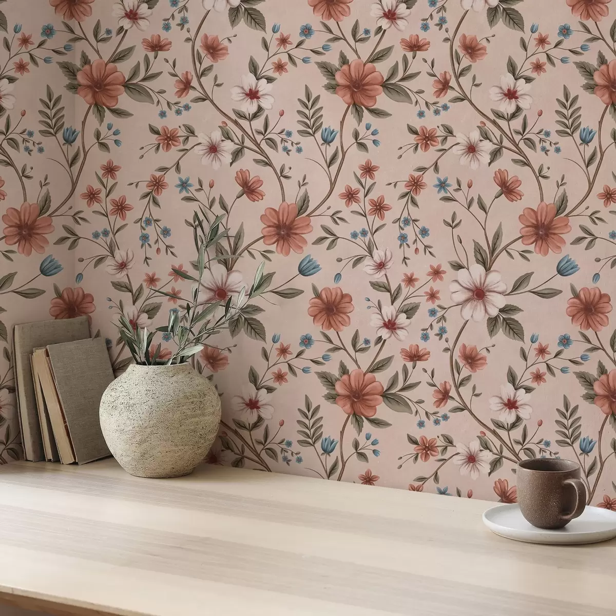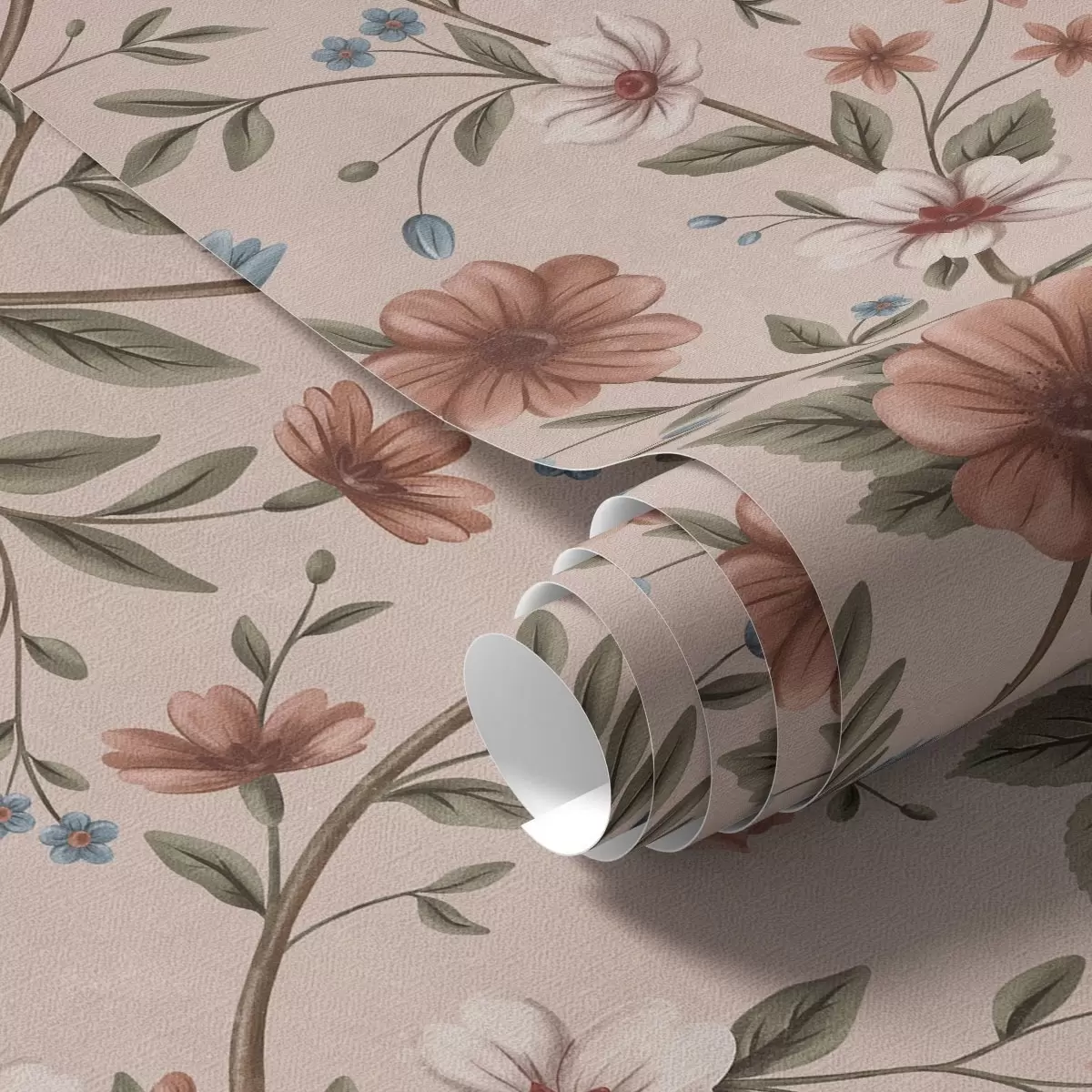 Carta da parati Fiori rosa corallo e fogliame su sfondo rosa antico Nr. a00667