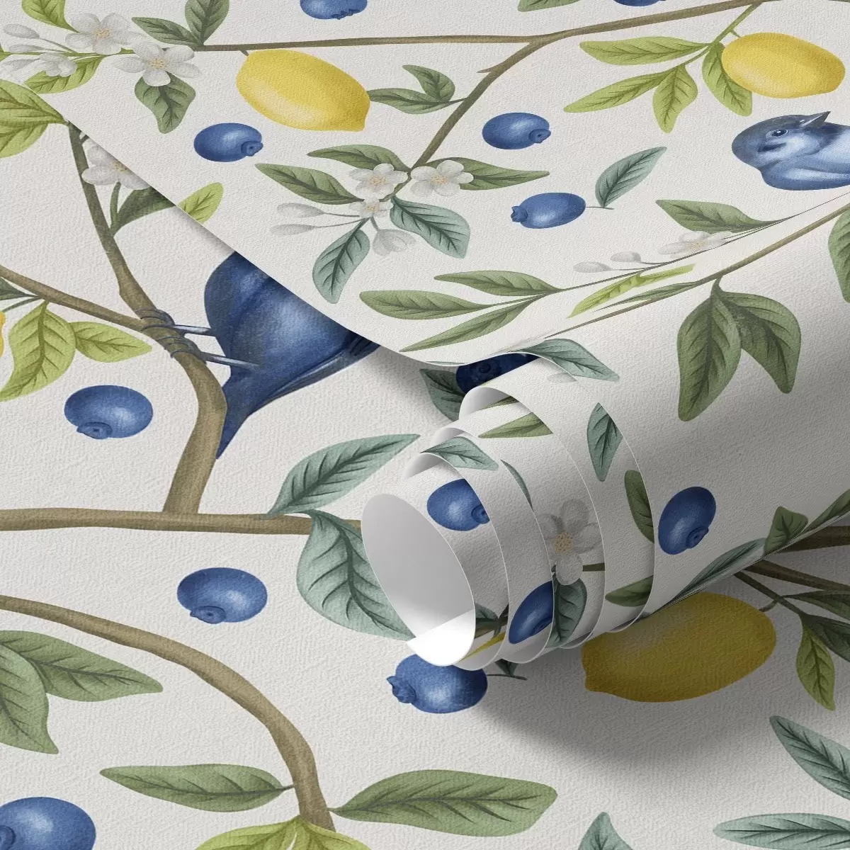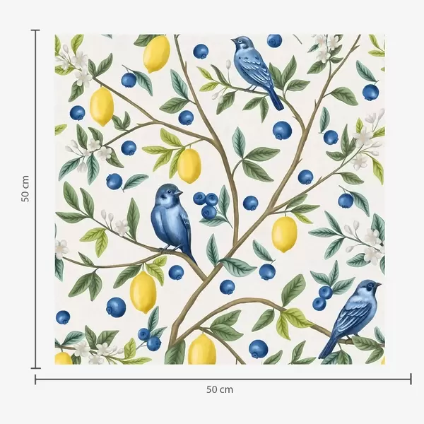 Carta da parati Uccellini blu, limoni e bacche su sfondo bianco Nr. a00668