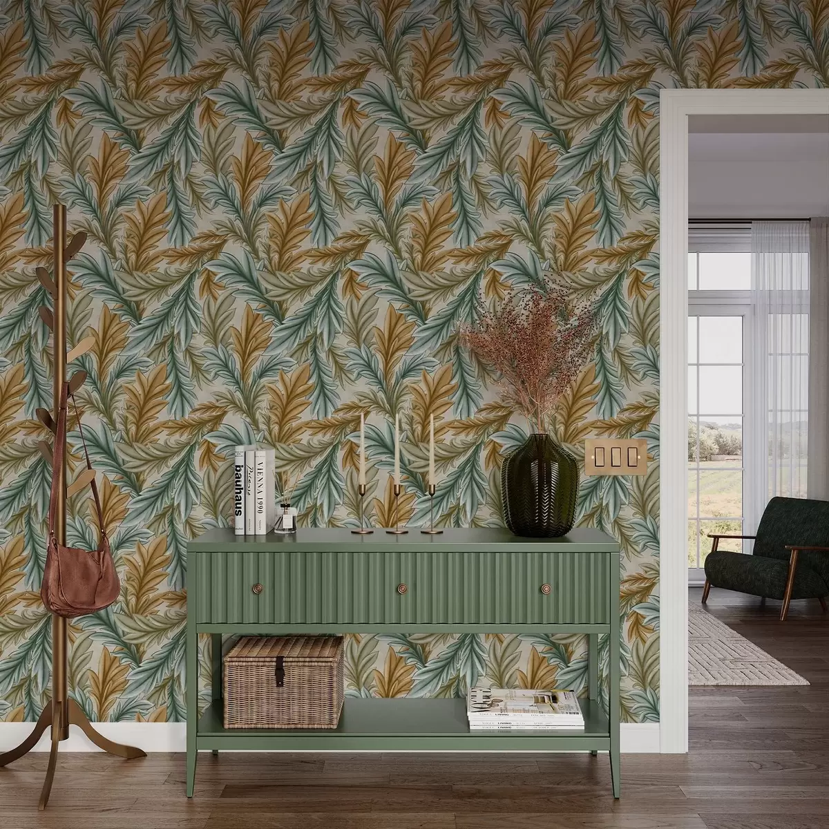 Carta da parati Fogliame decorativo in una calda palette di colori ocra e verde Nr. a00673