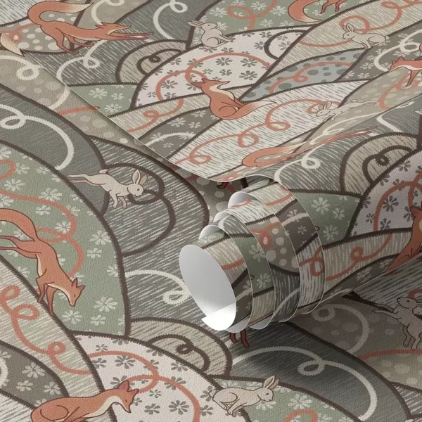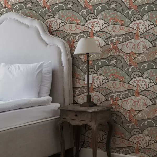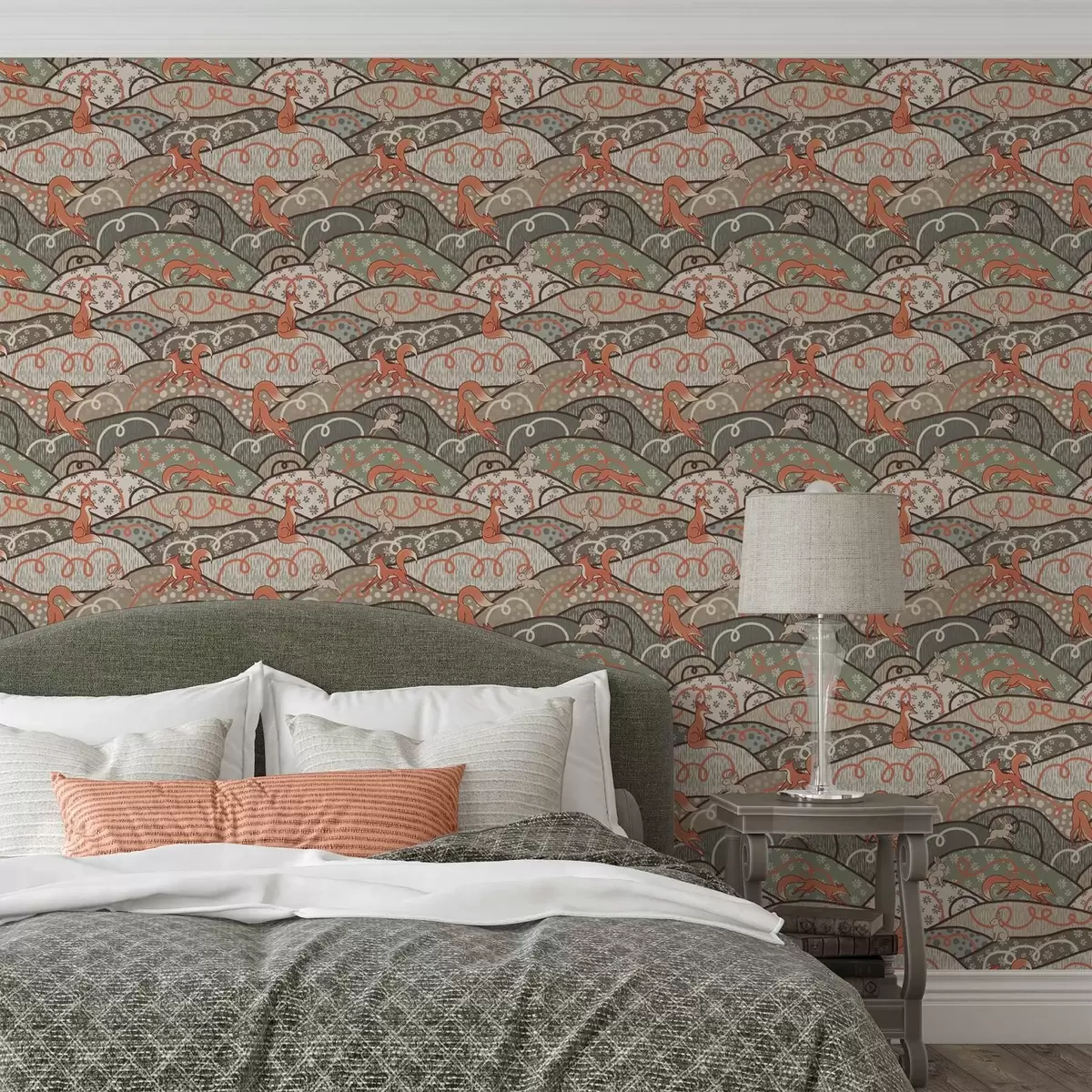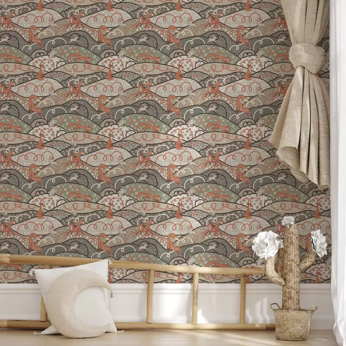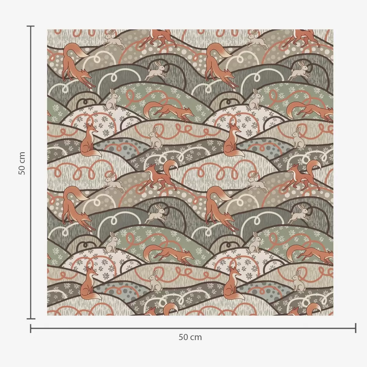 Carta da parati Volpi e lepri su colline ondulate, motivo retrò a00690