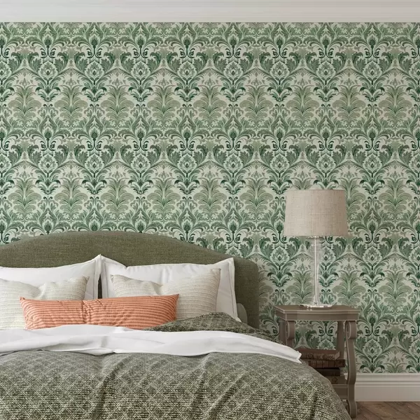 Carta da parati Damasco verde con texture in rilievo su sfondo chiaro Nr. a00692