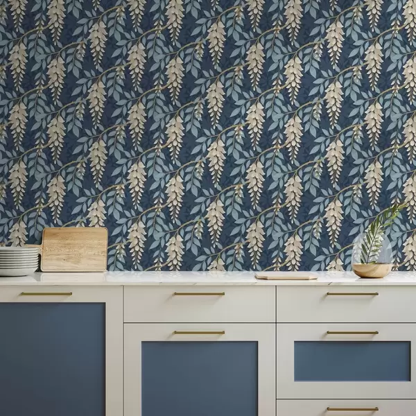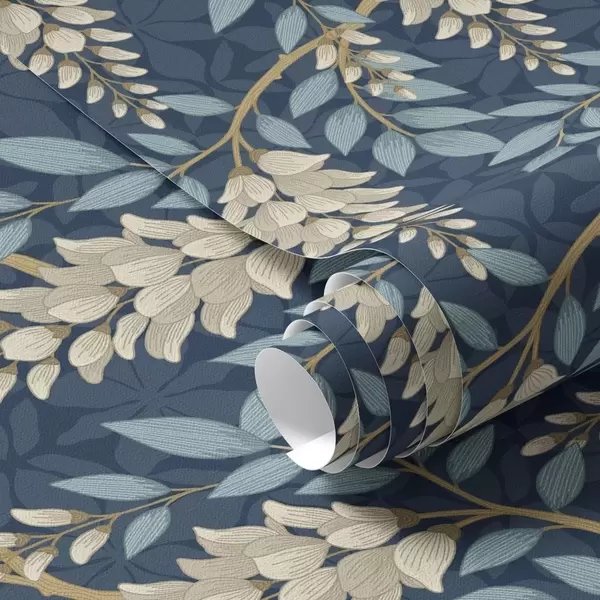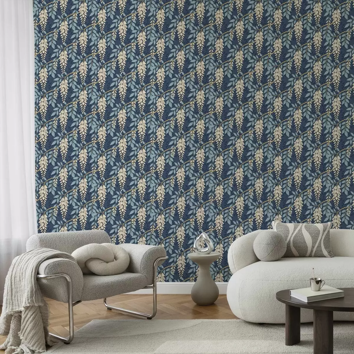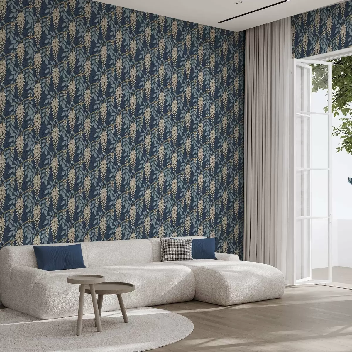 Carta da parati Glicine con foglie blu su sfondo blu scuro Nr. a00694v2