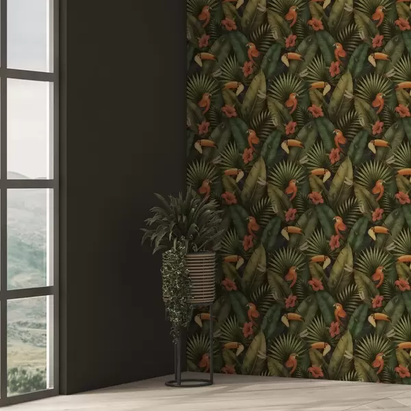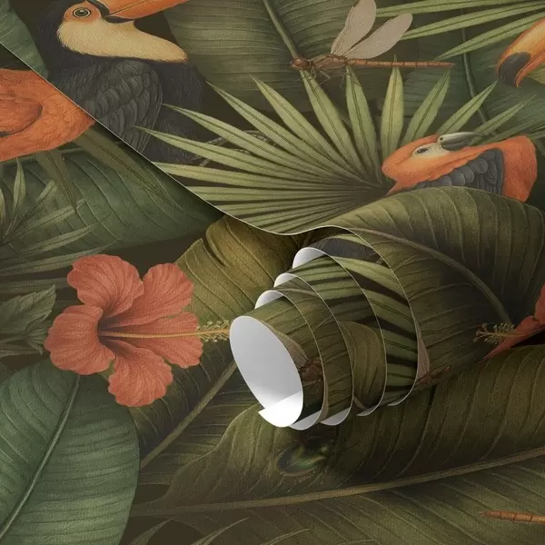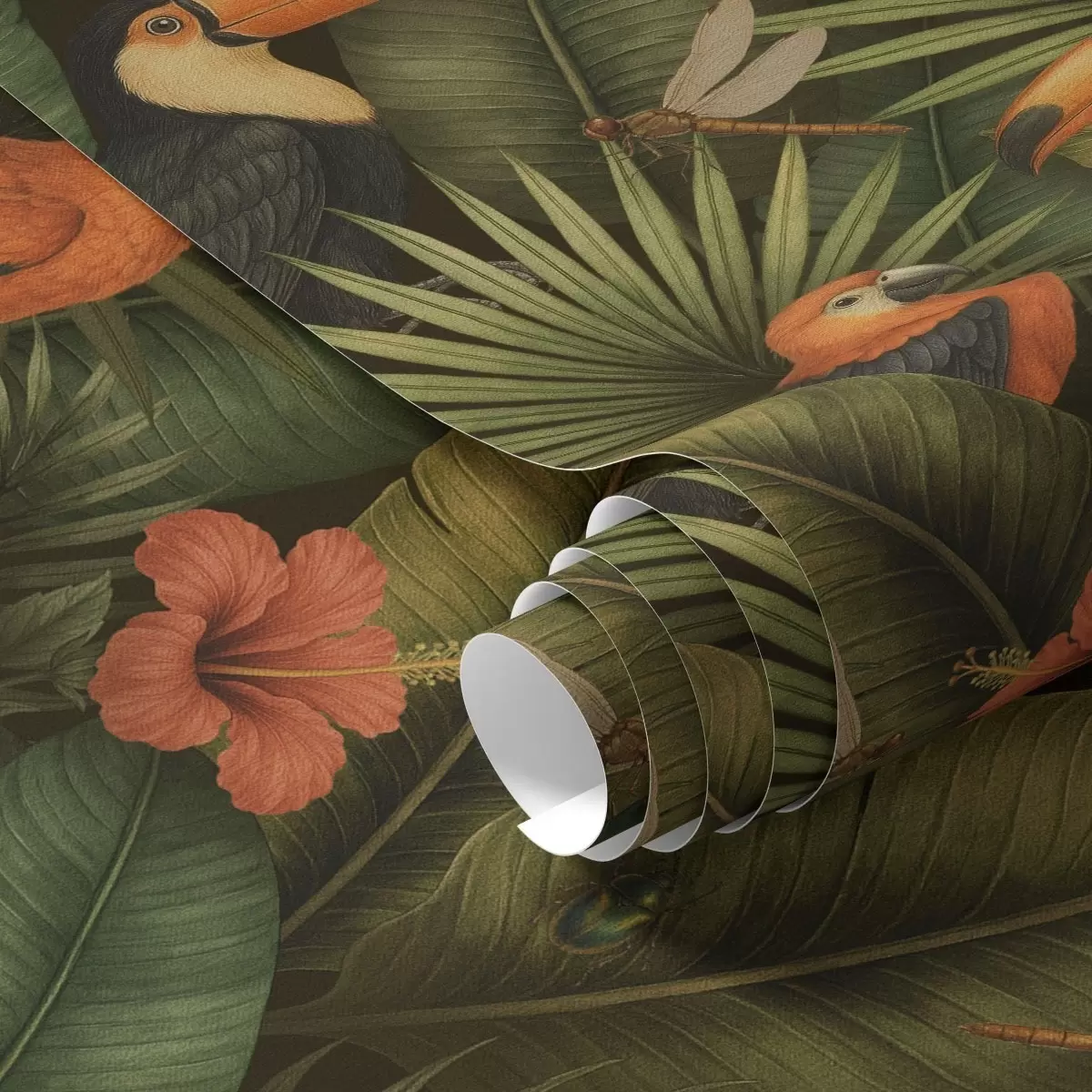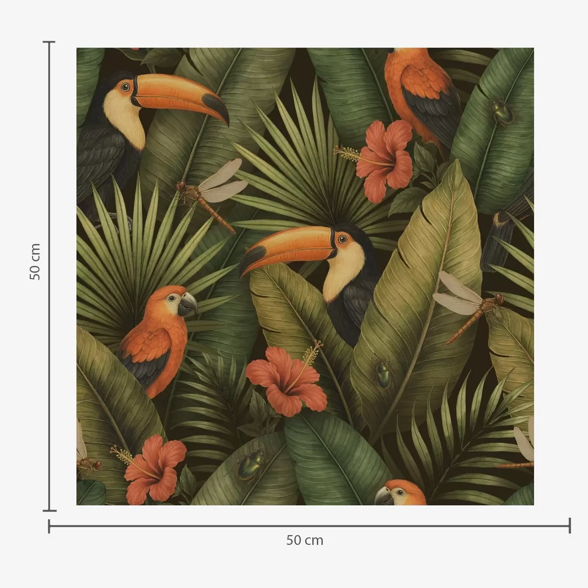 Carta da parati Tucani e pappagalli tra fogliame tropicale e fiori Nr. a00702
