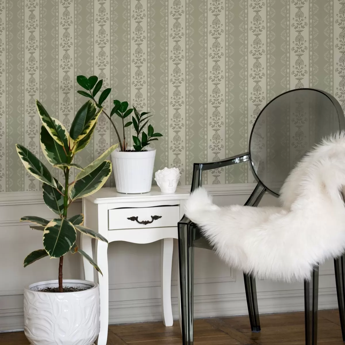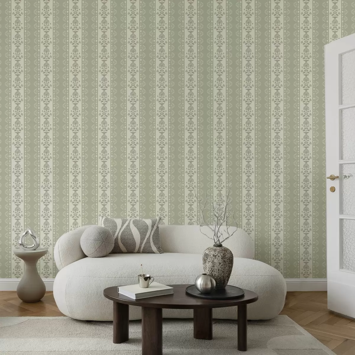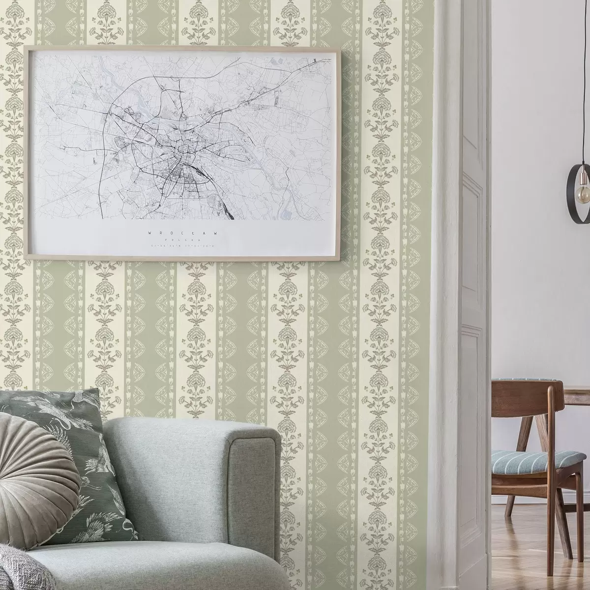 Carta da parati Ornamento a strisce con colonne floreali nei toni del salvia Nr. a00719