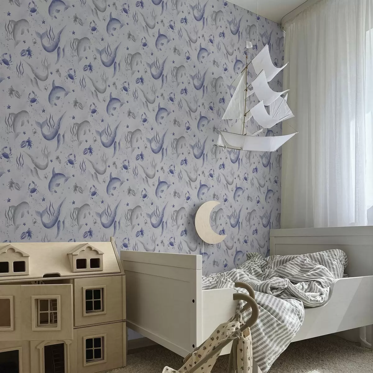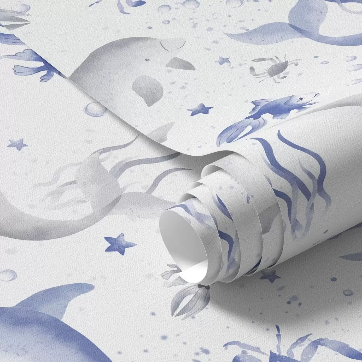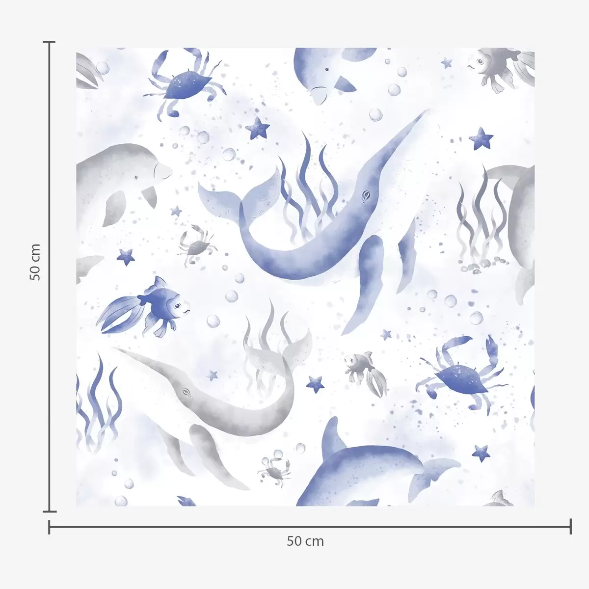 Carta da parati Balene marine e delfini in tonalità blu su sfondo bianco Nr. a00720v1