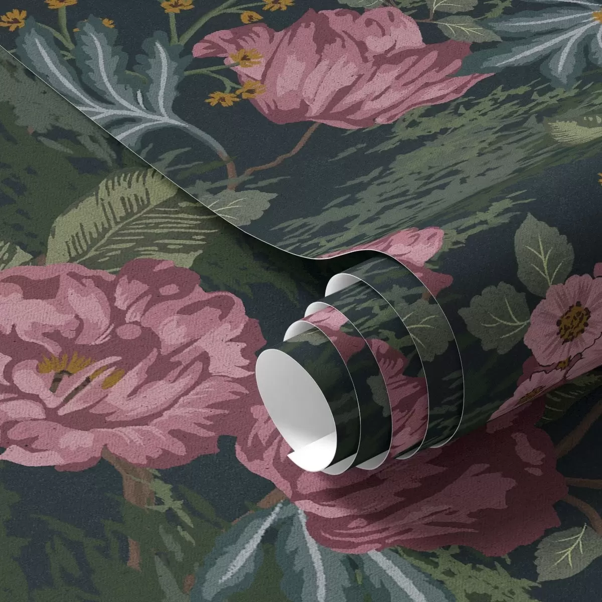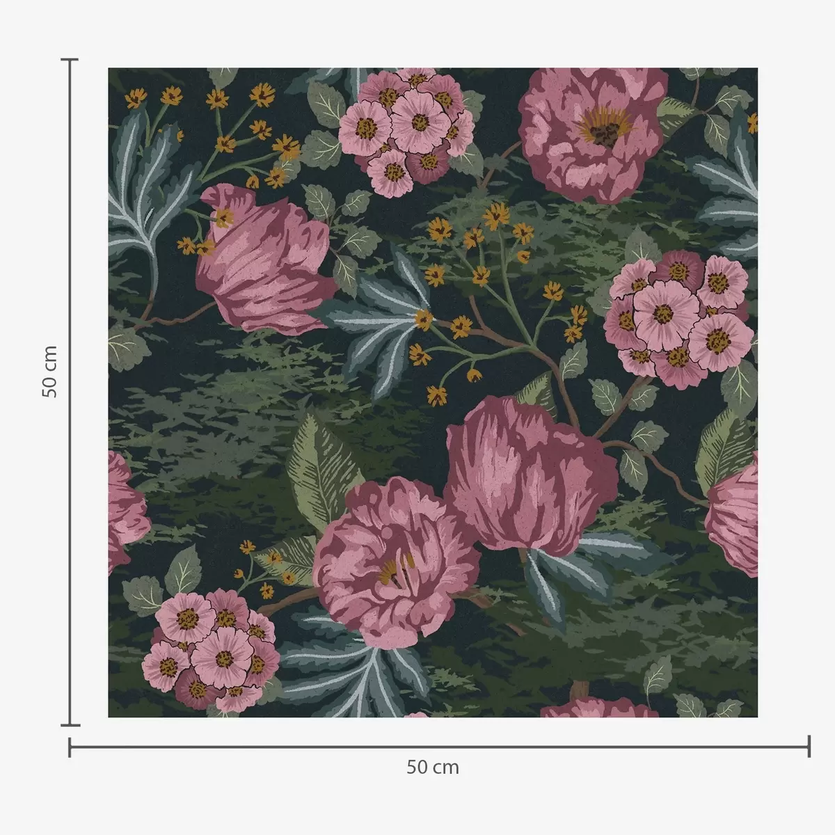 Carta da parati Flora scura con fiori e foglie rosa, sfondo intenso Nr. a00724