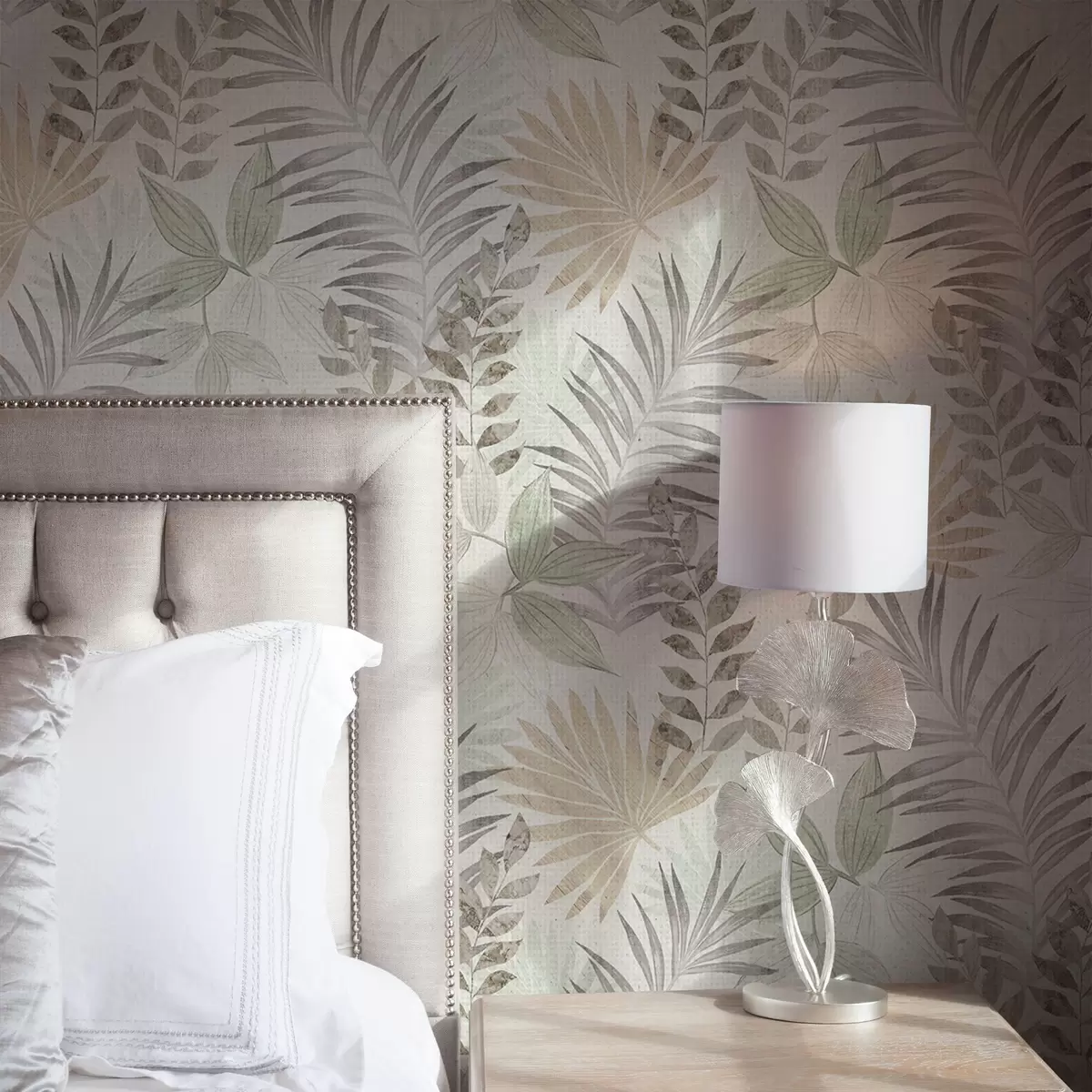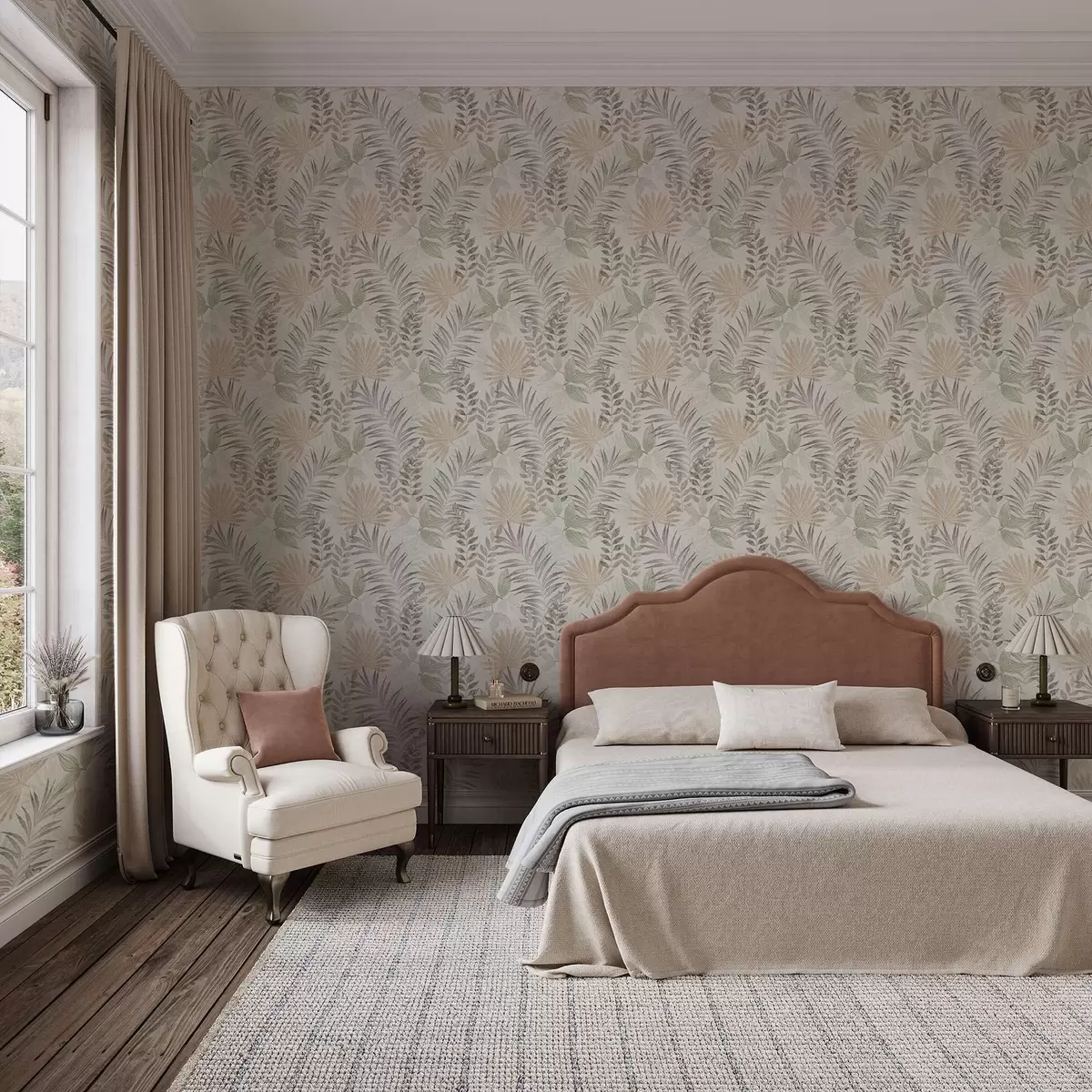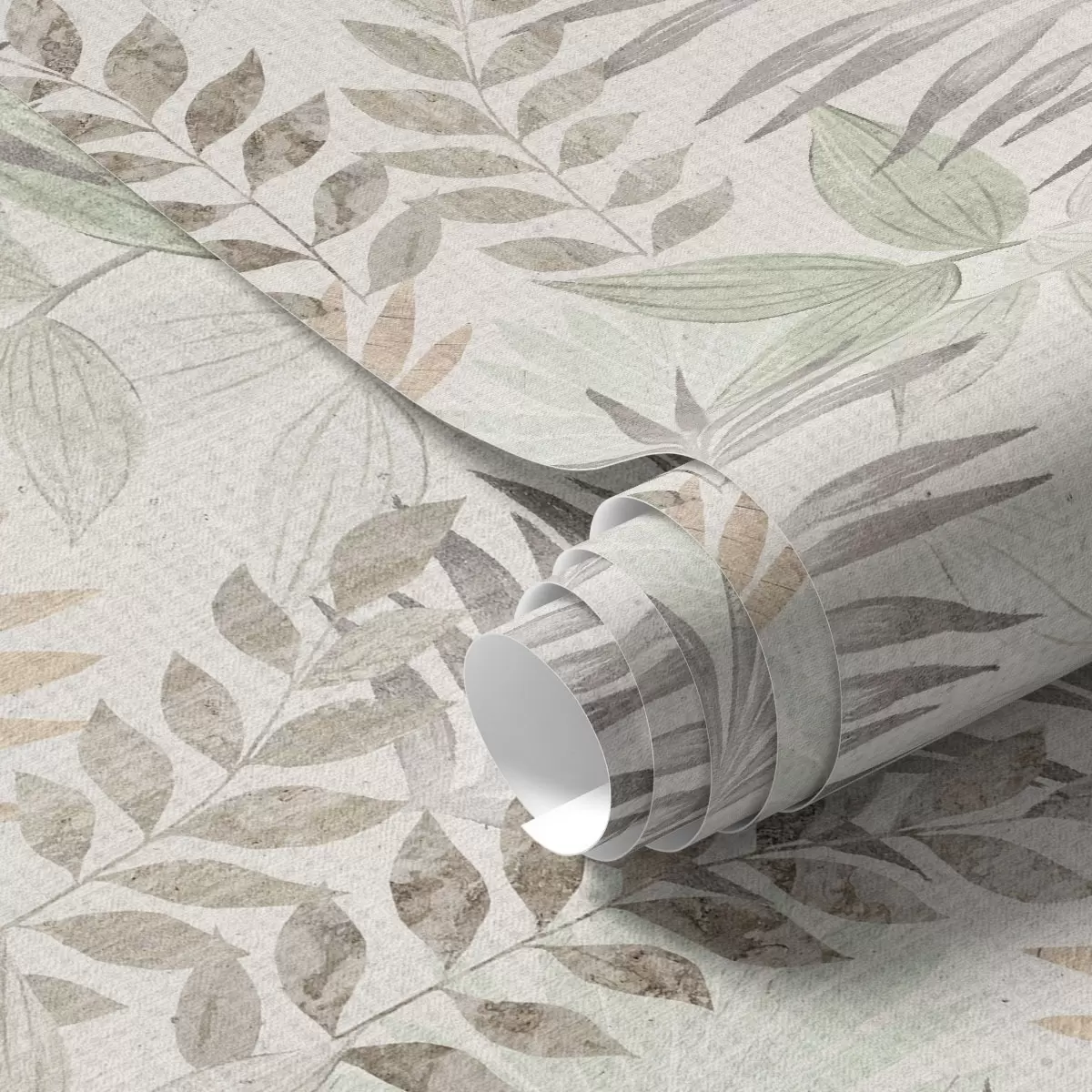Carta da parati Foglie tropicali dai colori pastello su sfondo chiaro, texture delicata Nr. a00725
