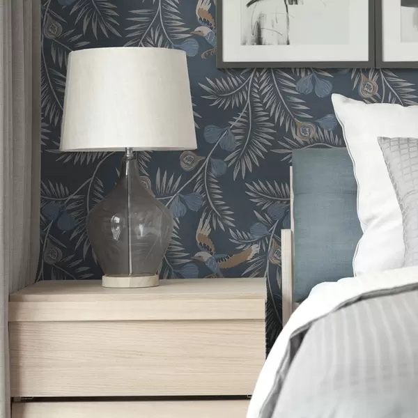 Carta da parati Uccello tra frutti blu e foglie di palma, indaco Nr. a00726