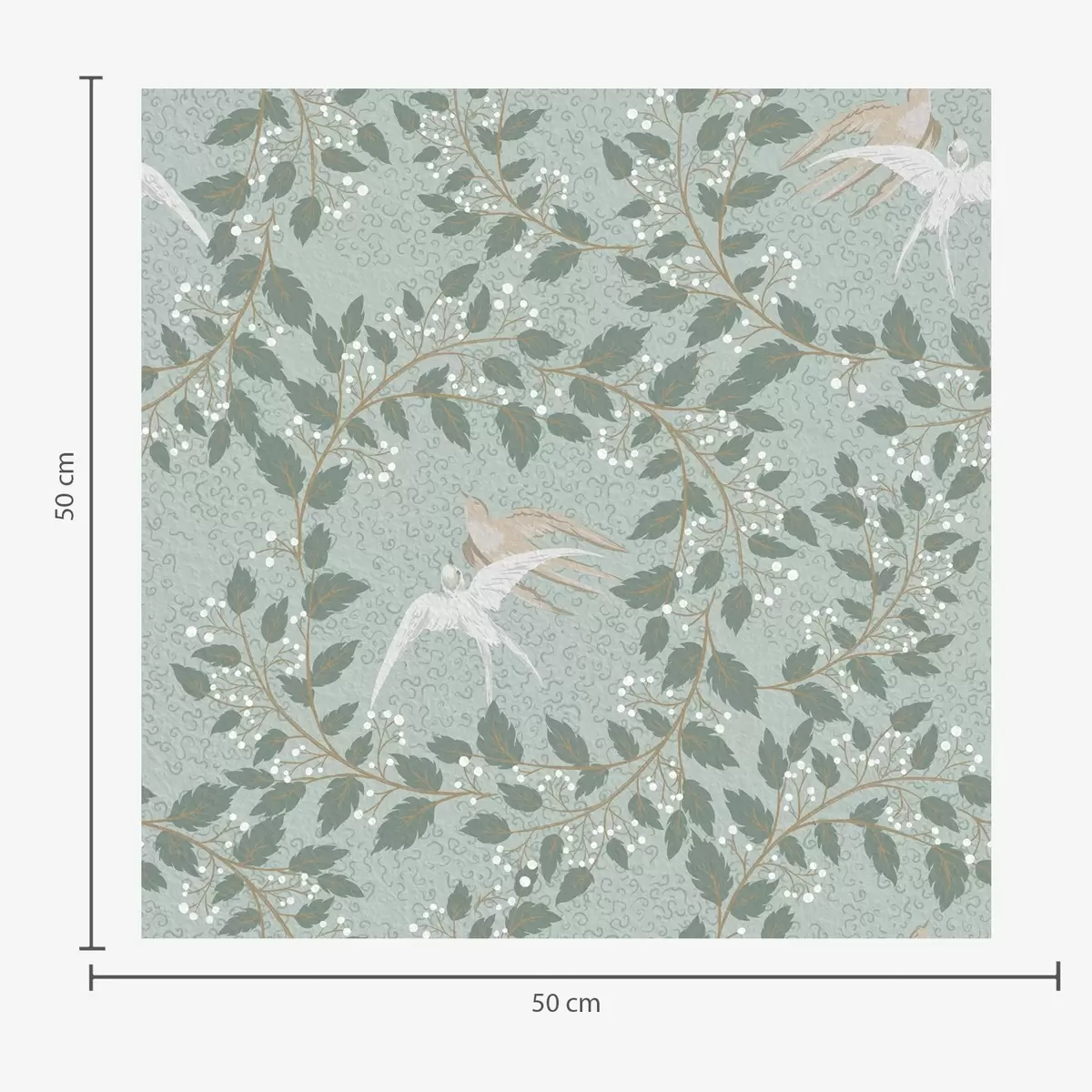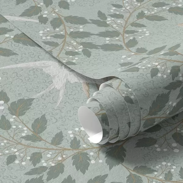 Carta da parati Rami con bacche bianche e uccelli su sfondo verde Nr. a00731