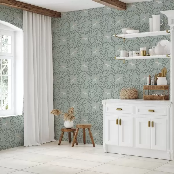 Carta da parati Rami con bacche bianche e uccelli su sfondo verde Nr. a00731