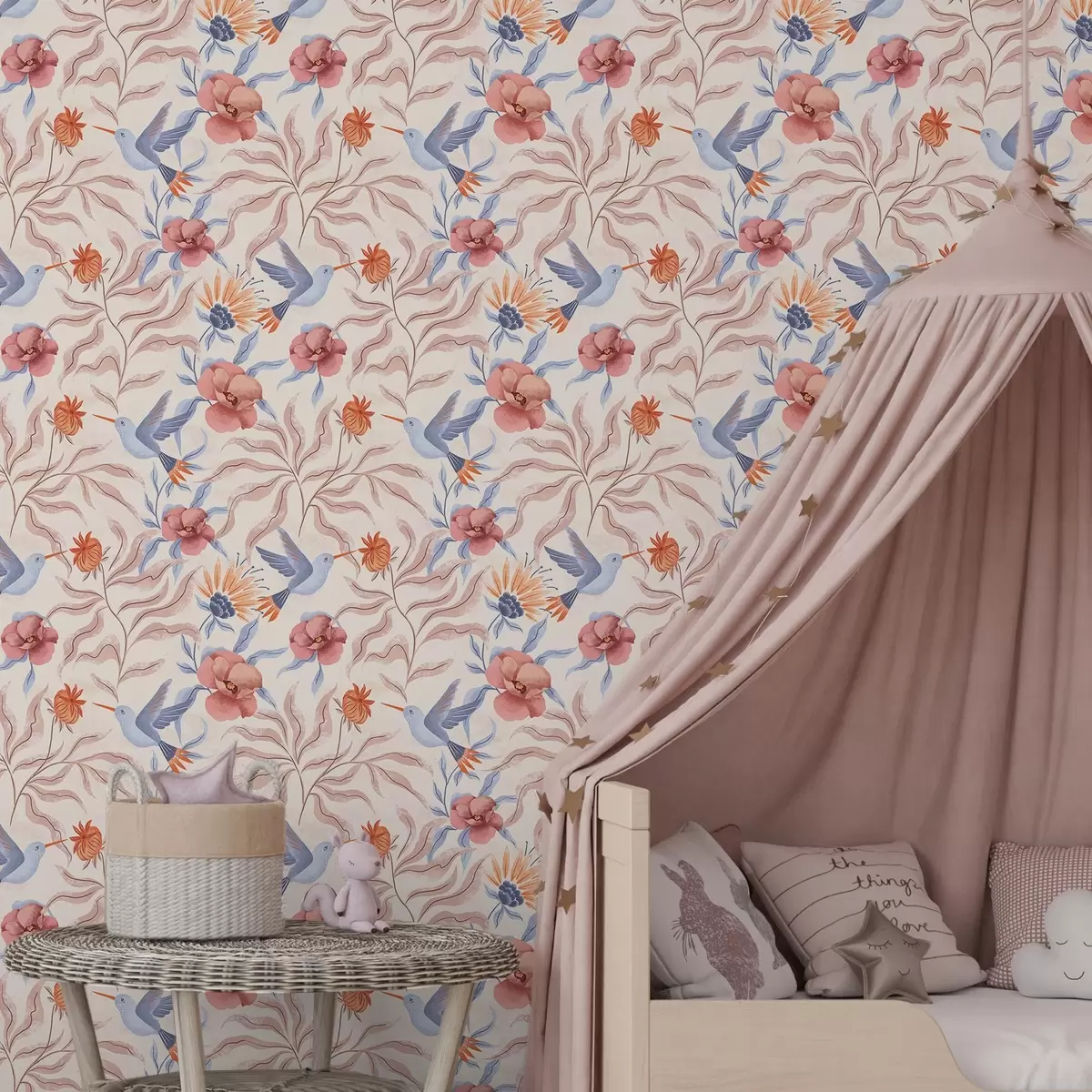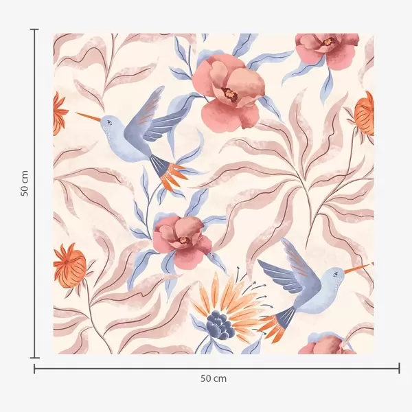 Carta da parati Colibrì tra grandi fiori nei toni del rosa e del blu Nr. a00733