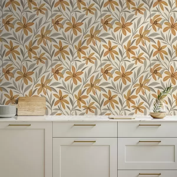 Carta da parati Gigli gialli e foglie grigio-verdi su sfondo chiaro Nr. a00757