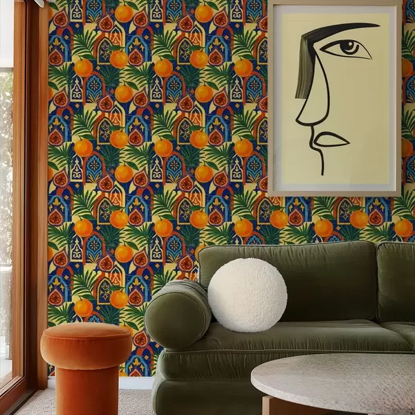 Carta da parati Arancioni brillanti, foglie di palma e archi marocchini Nr. a00767