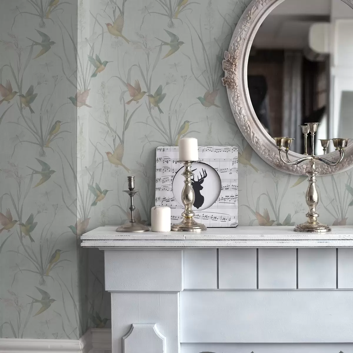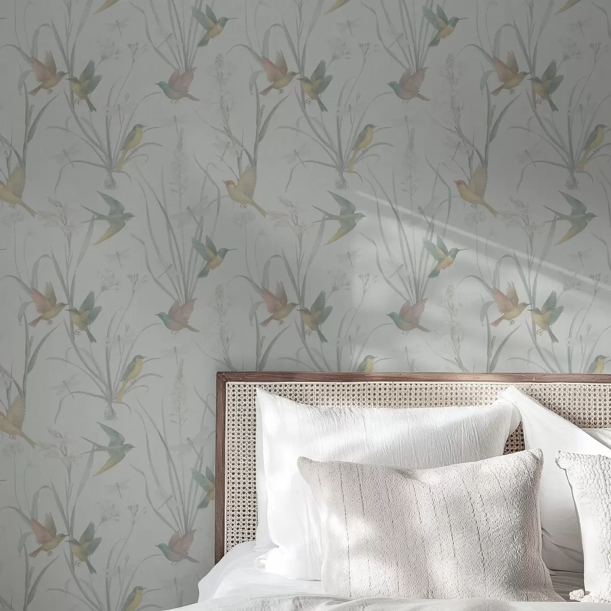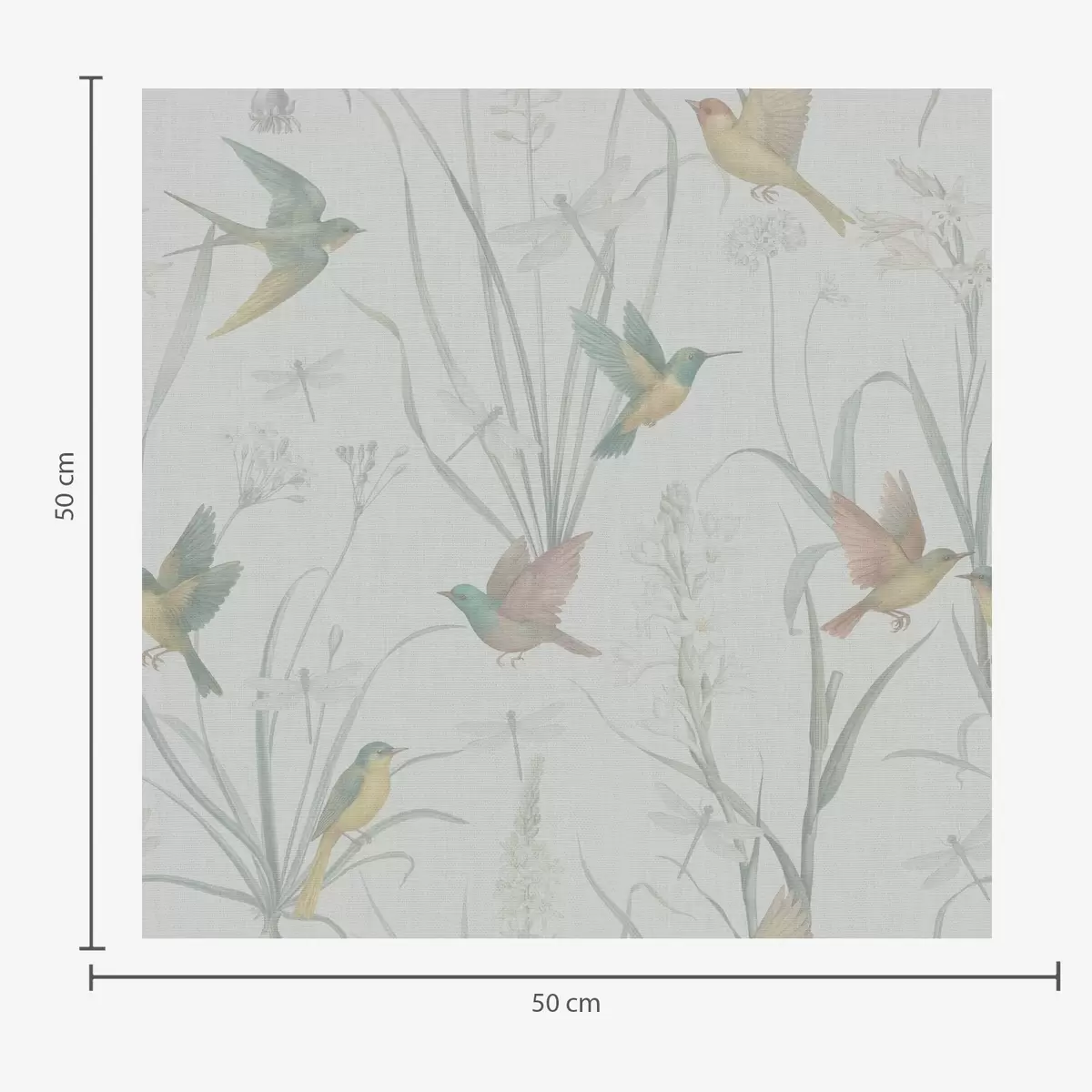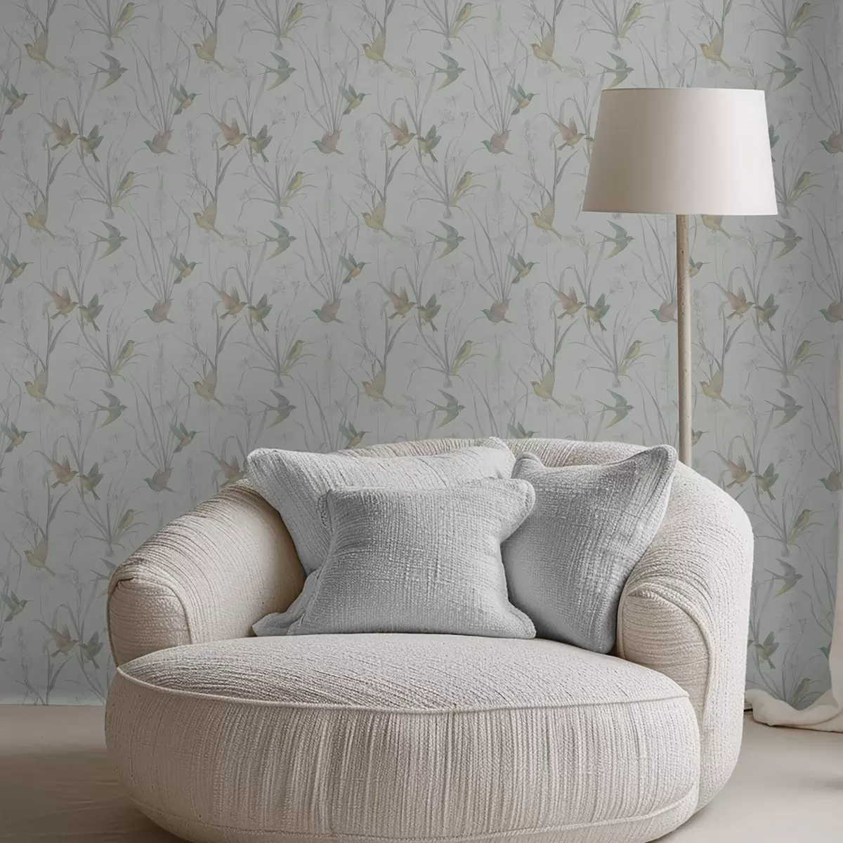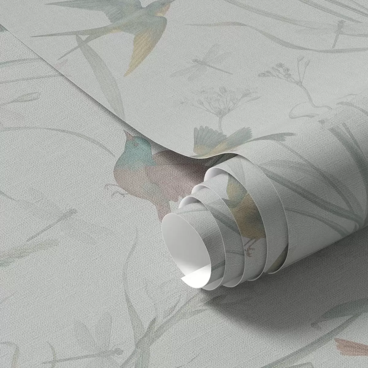 Carta da parati Uccelli tra l'erba dei prati su sfondo grigio chiaro Nr. a00776v1