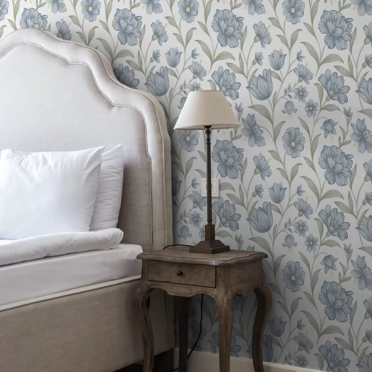 Carta da parati Fiori blu polverosi con foglie di olivo su sfondo bianco Nr. a00780