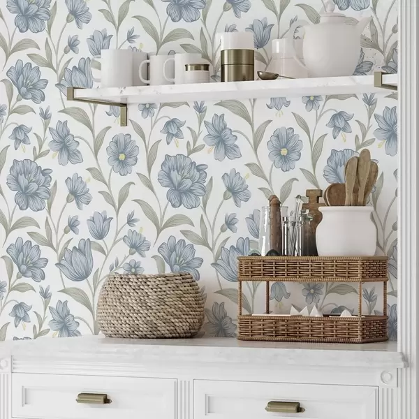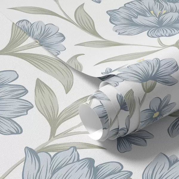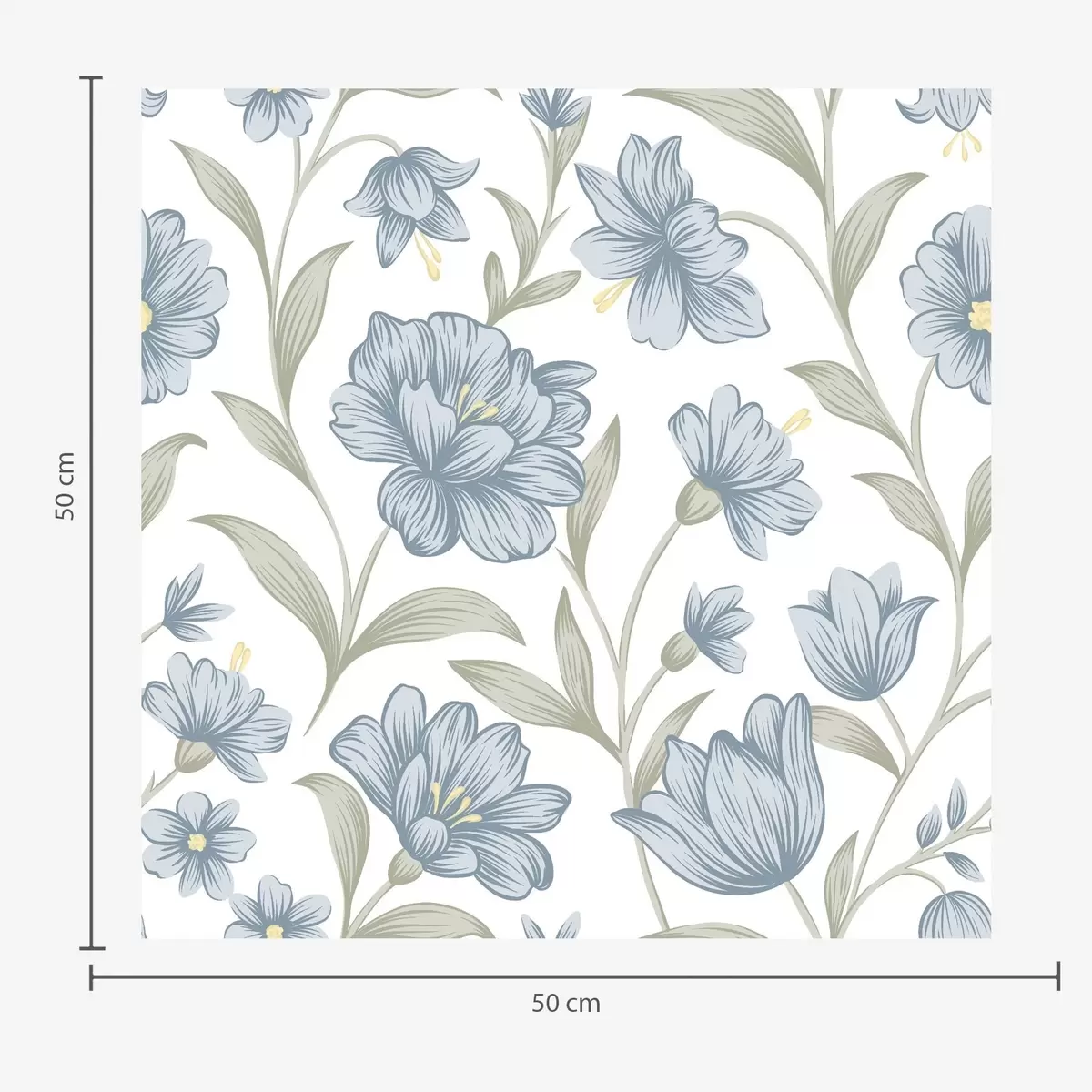 Carta da parati Fiori blu polverosi con foglie di olivo su sfondo bianco Nr. a00780