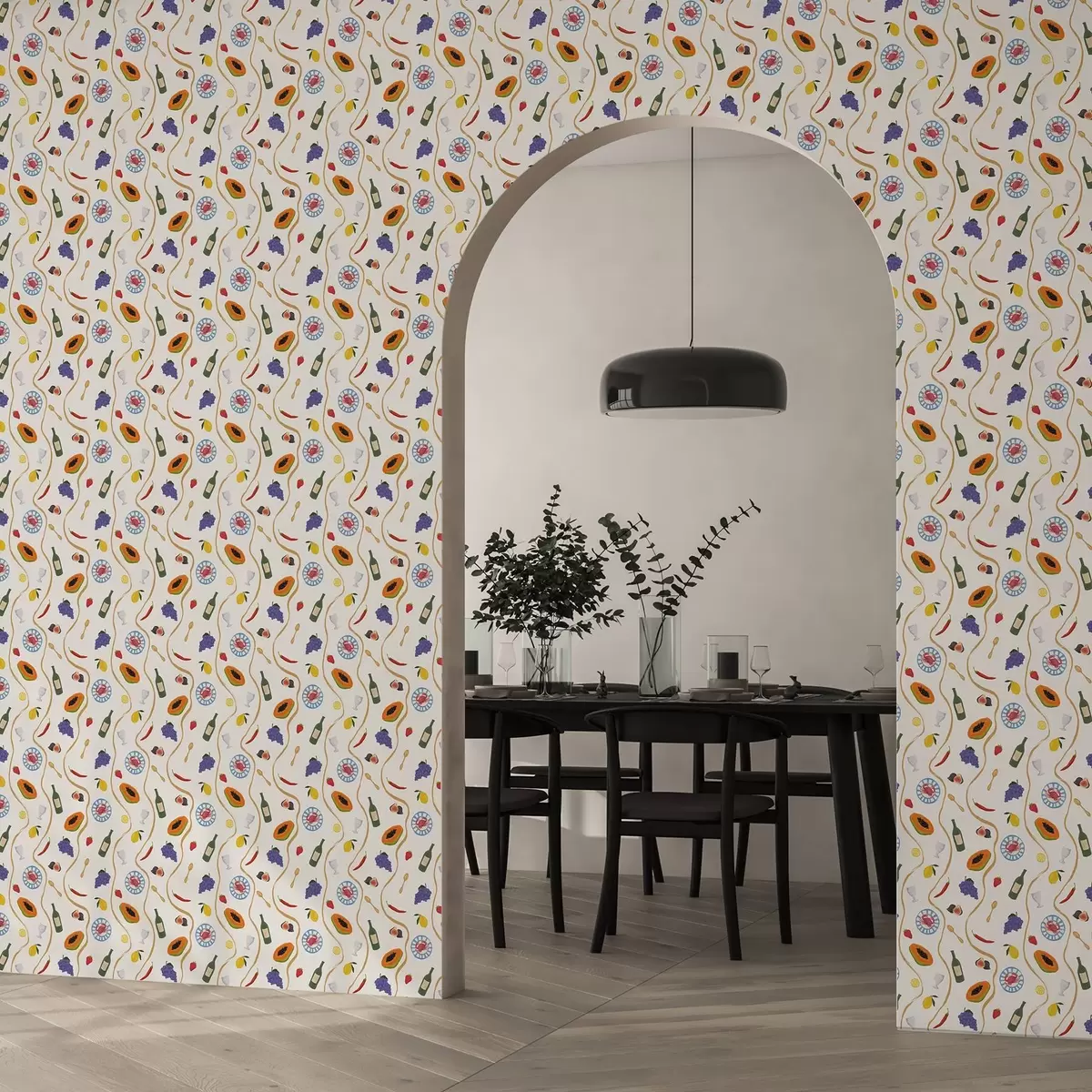 Carta da parati Bottiglie, papaya, limoni e spezie su sfondo chiaro Nr. a00802