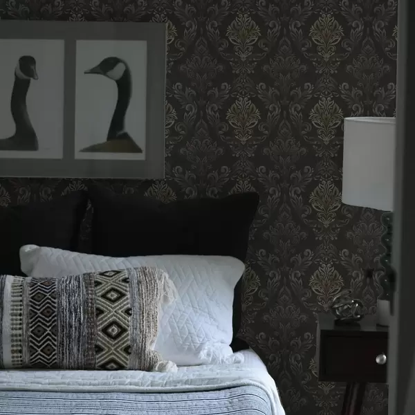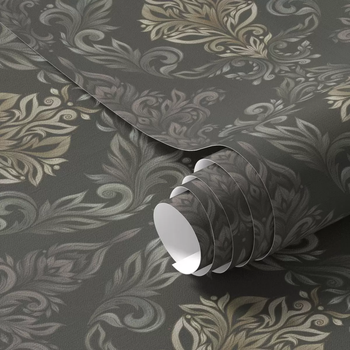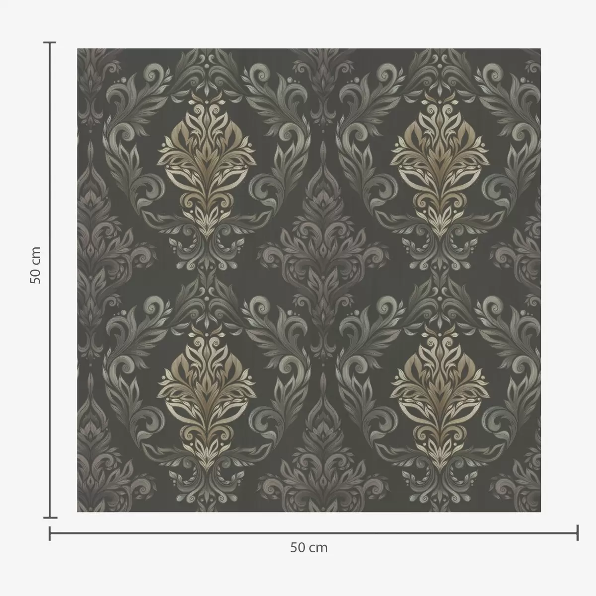 Carta da parati Damasco su fondo grafite scuro, accenti color ocra oliva Nr. a00828v5