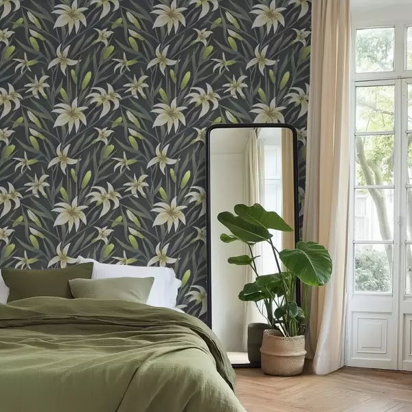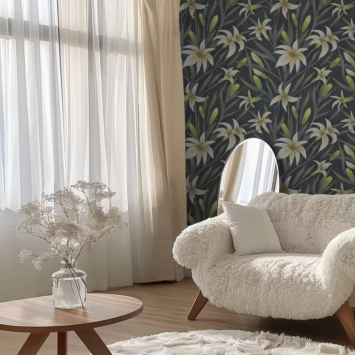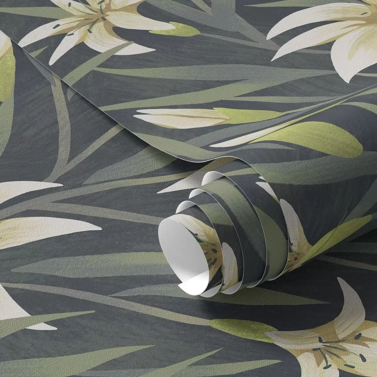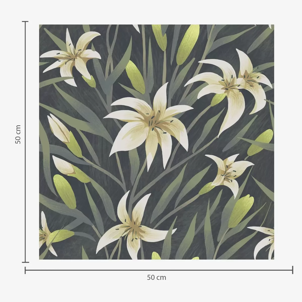 Carta da parati Gigli color crema con foglie su sfondo scuro Nr. a00837v1