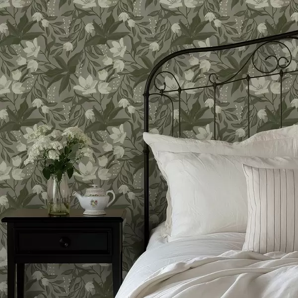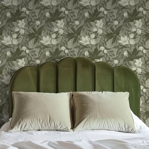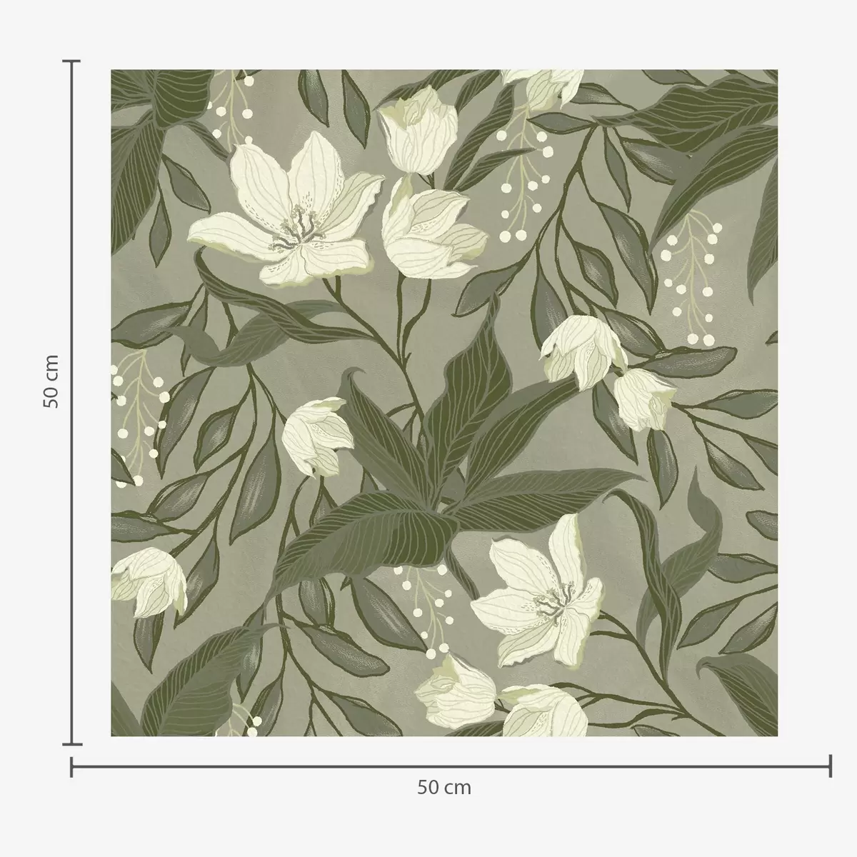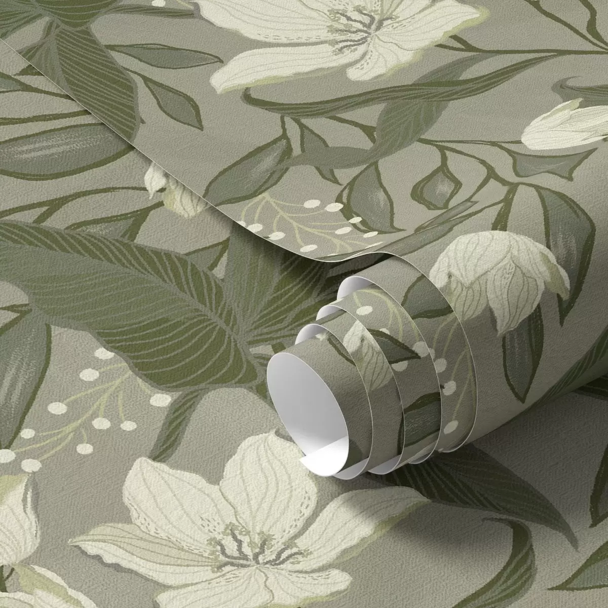 Carta da parati Gigli pallidi e fogliame su sfondo grigio-oliva Nr. a00854