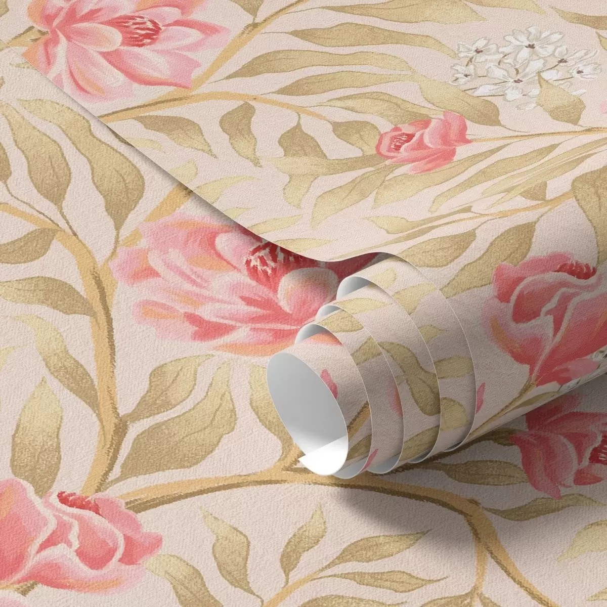 Carta da parati Fiori rosa, boccioli bianchi e fogliame dai toni ocra Nr. a00855