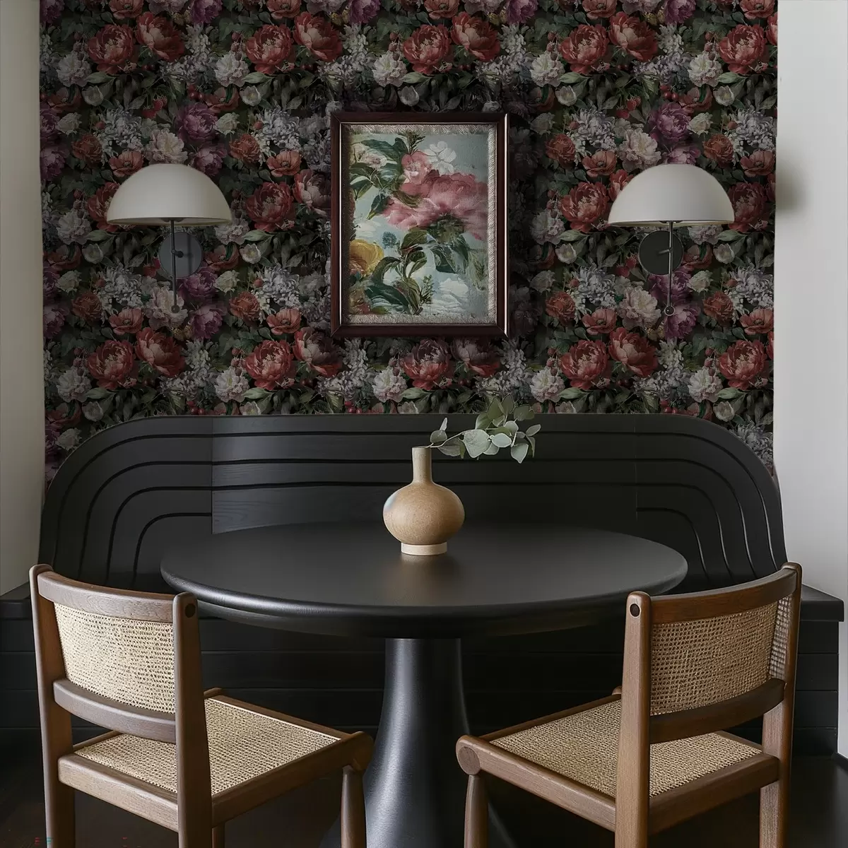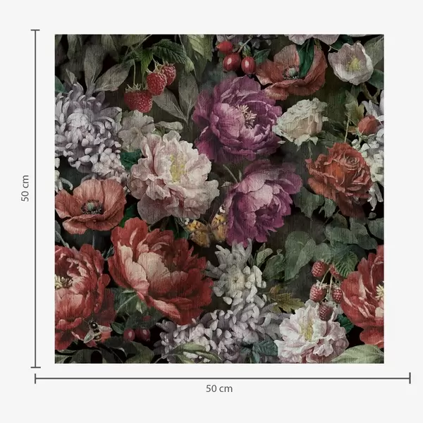 Carta da parati Peonie scure e drammatiche, bacche e farfalla su sfondo nero Nr. a00862