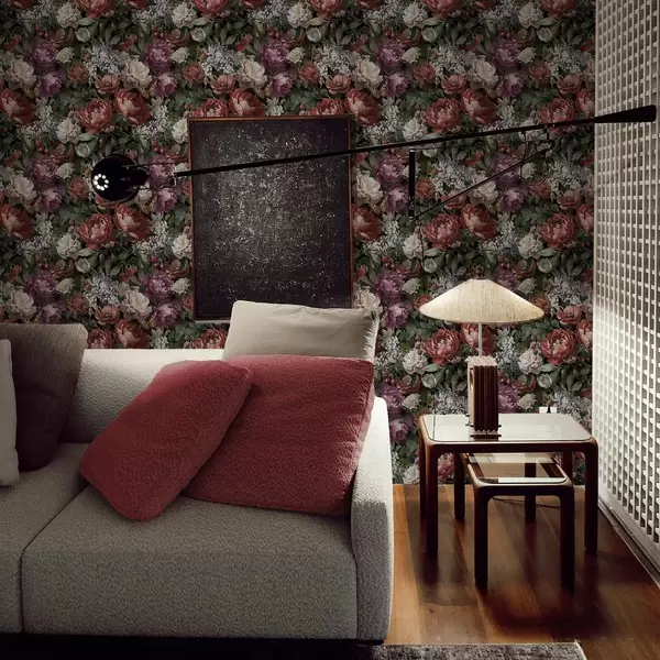 Carta da parati Peonie scure e drammatiche, bacche e farfalla su sfondo nero Nr. a00862