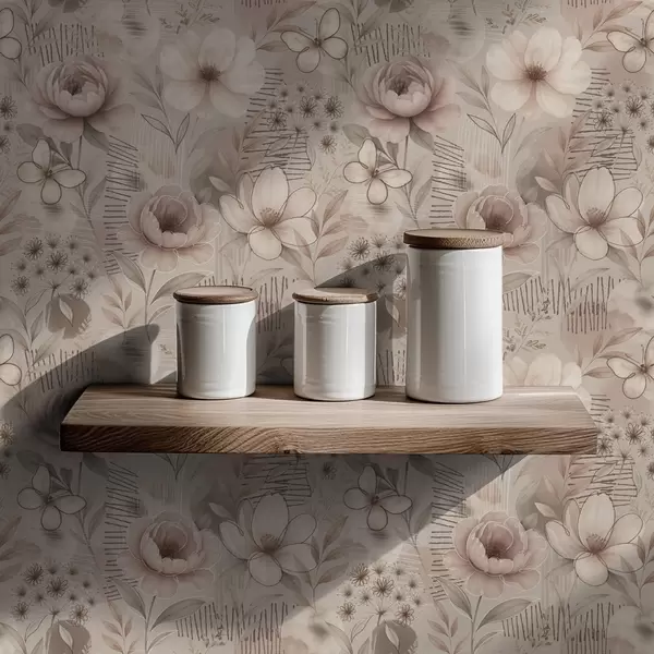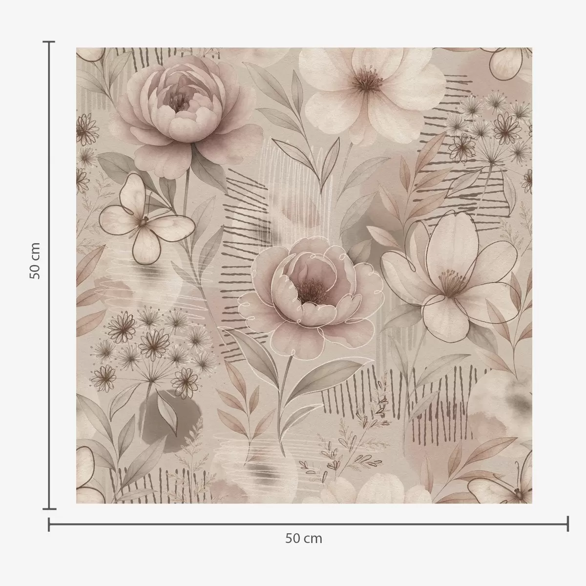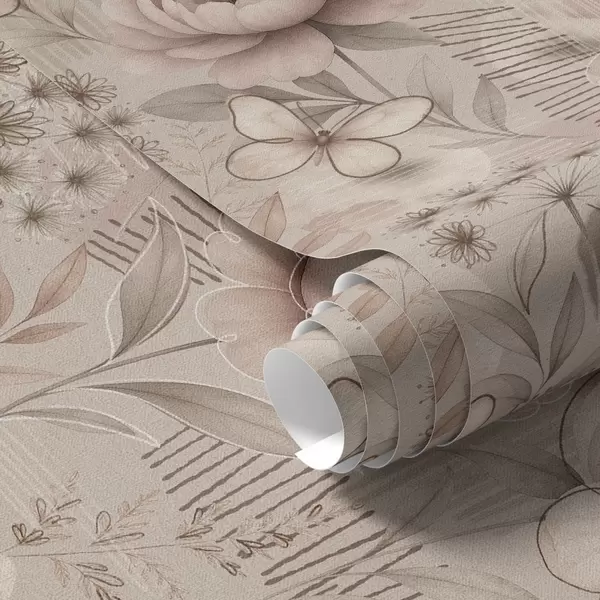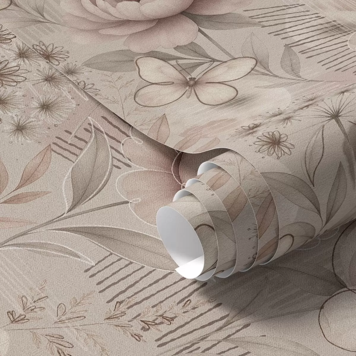 Carta da parati Motivi floreali color beige seppia con accenti lineari e farfalle Nr. a00870