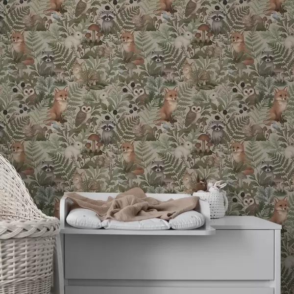 Carta da parati Animali del bosco, felci e funghi su sfondo beige chiaro Nr. a00880v1