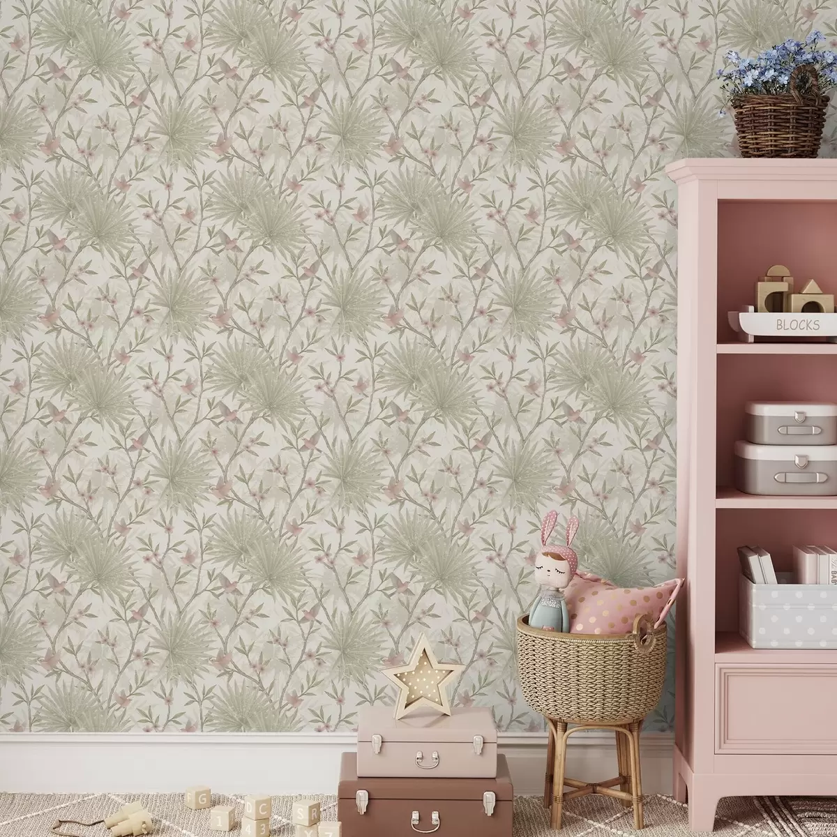 Carta da parati Delicati uccellini rosa tra le foglie di palma Nr. a00883