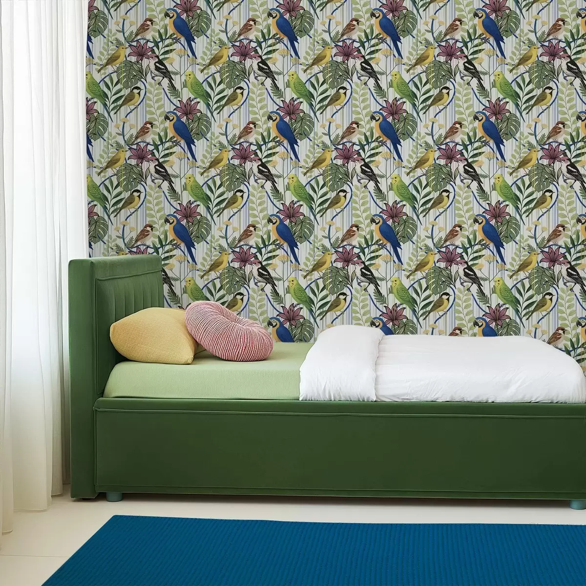 Carta da parati Uccelli esotici dai colori vivaci tra la vegetazione tropicale Nr. a00887