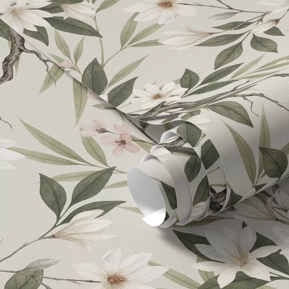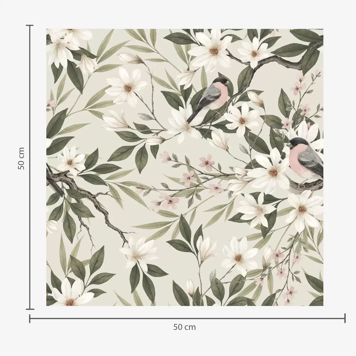 Carta da parati Cardellini dal petto bianco su rami con fiori color crema Nr. a00889