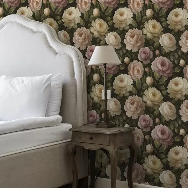 Carta da parati Peonie romantiche su uno sfondo botanico scuro Nr. a00893