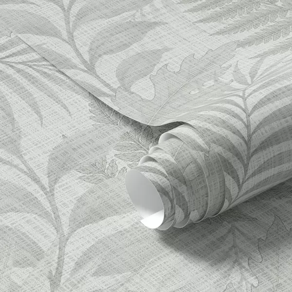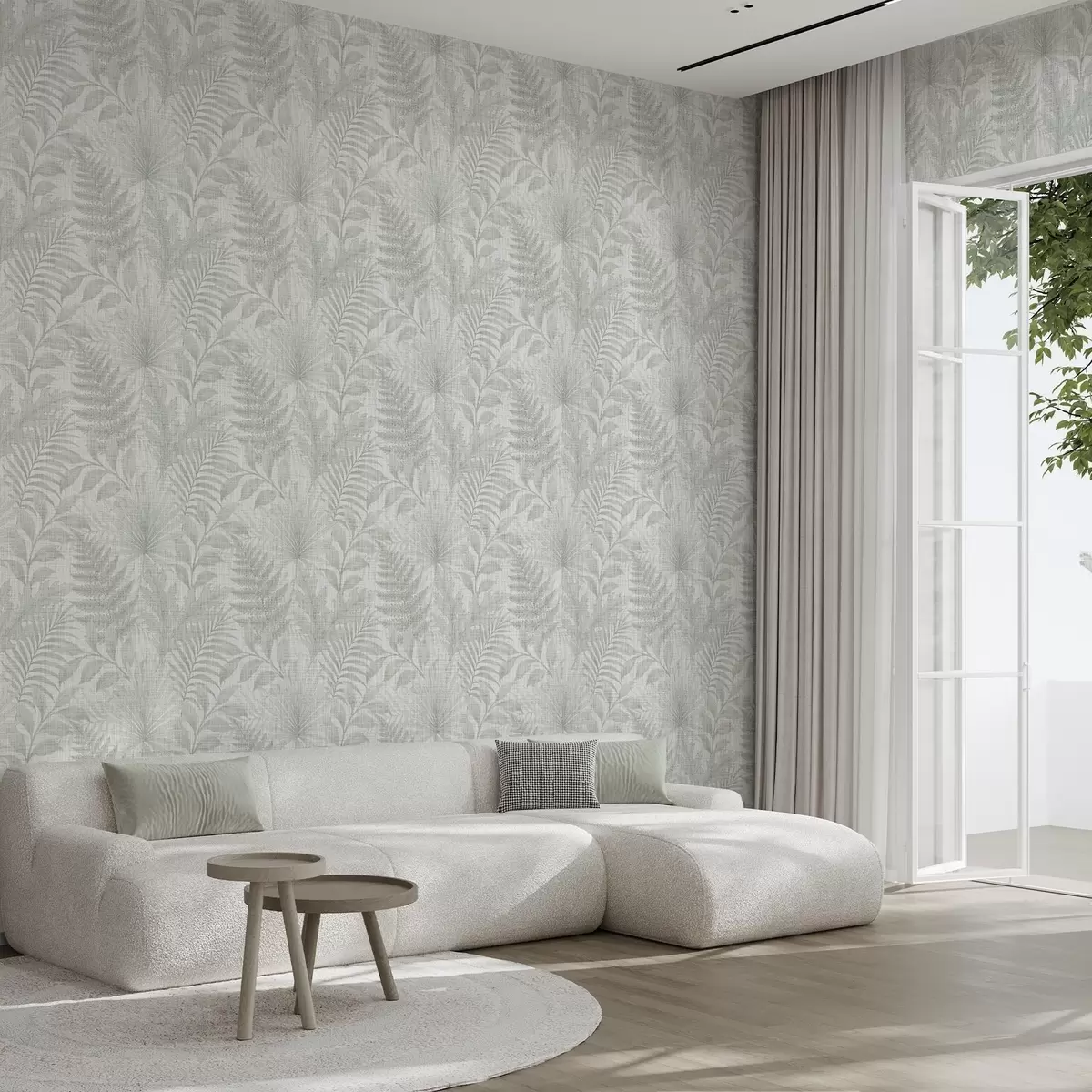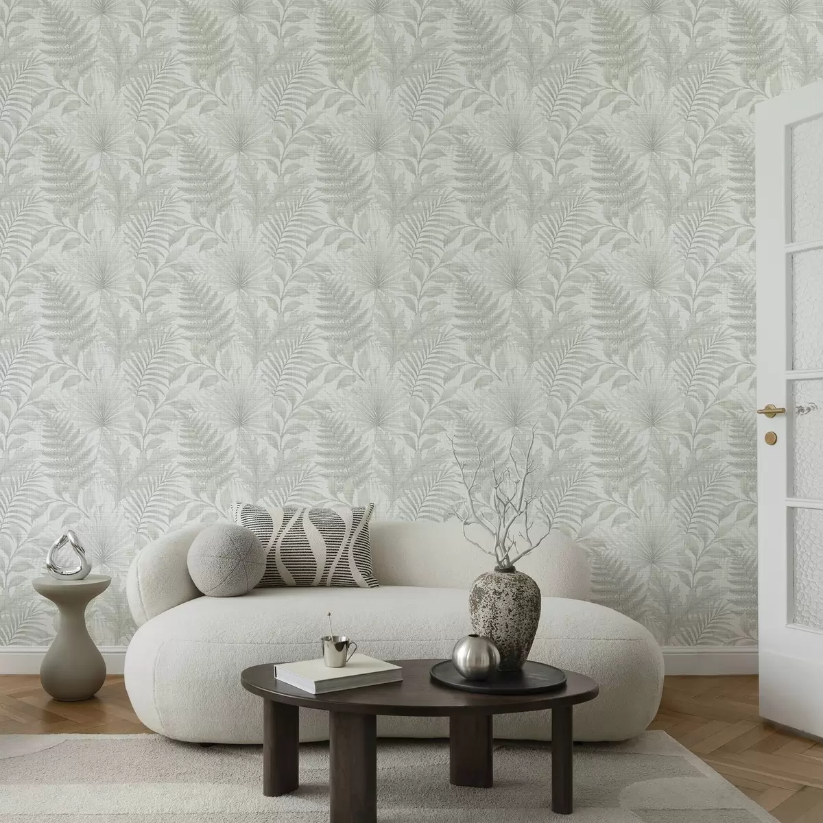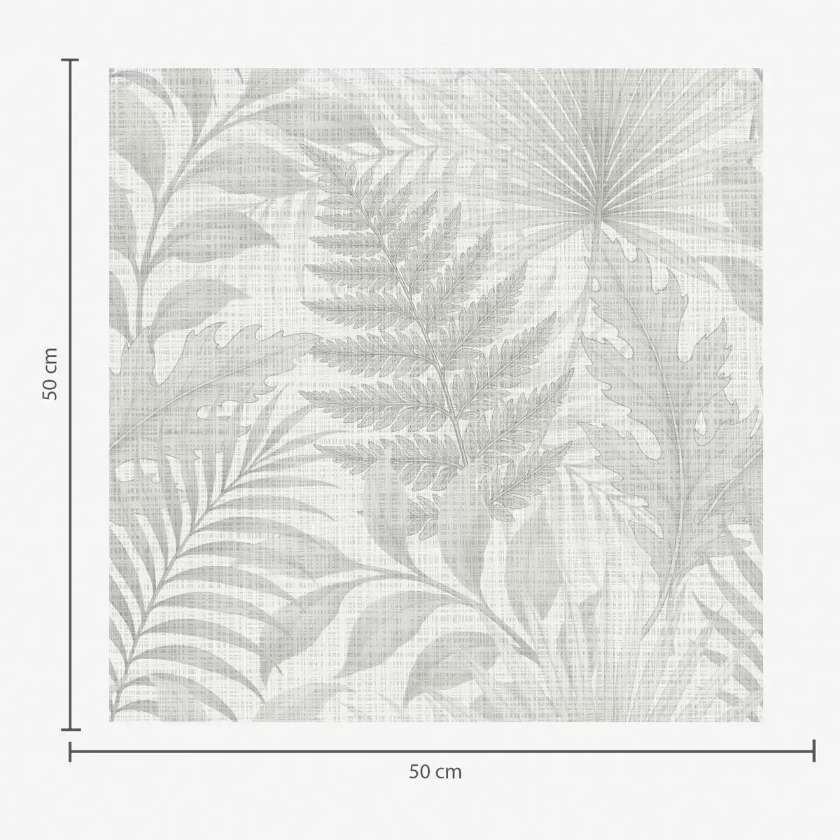 Carta da parati Morbide foglie tropicali in grigio chiaro su texture di lino Nr. a00899
