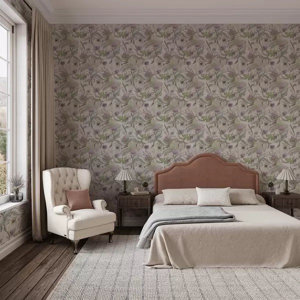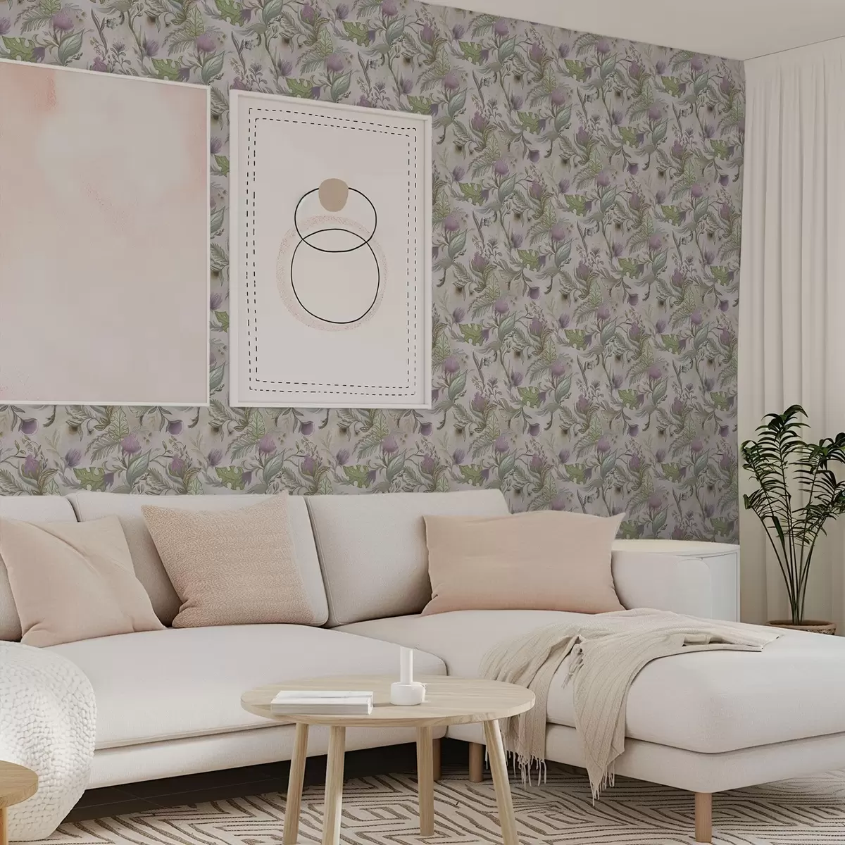 Carta da parati Fiori selvatici di lillà e foglie su sfondo polveroso Nr. a00930v3