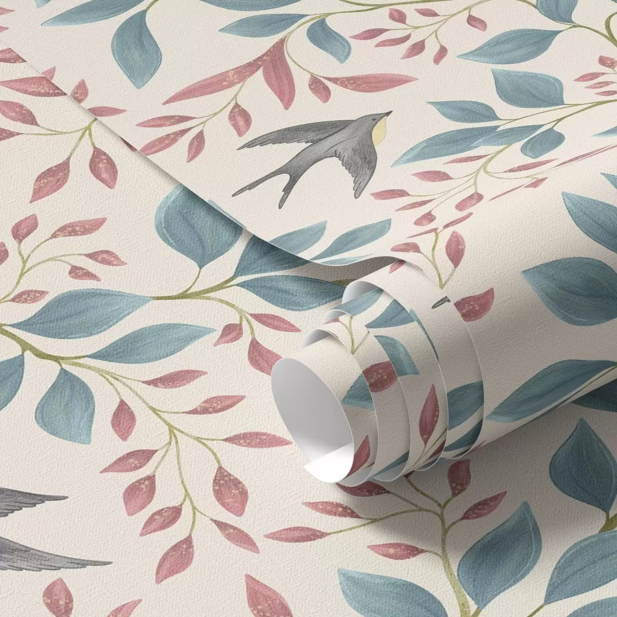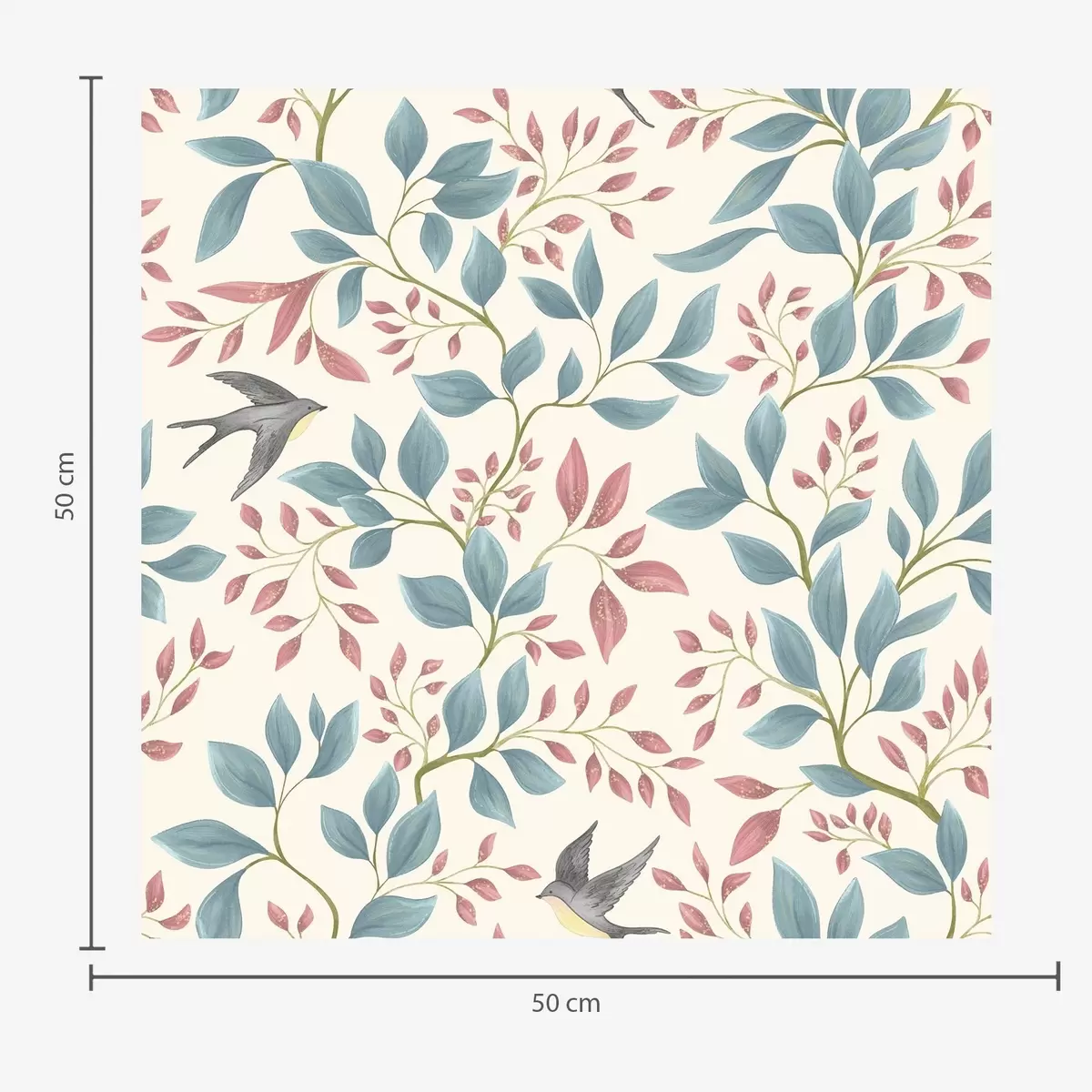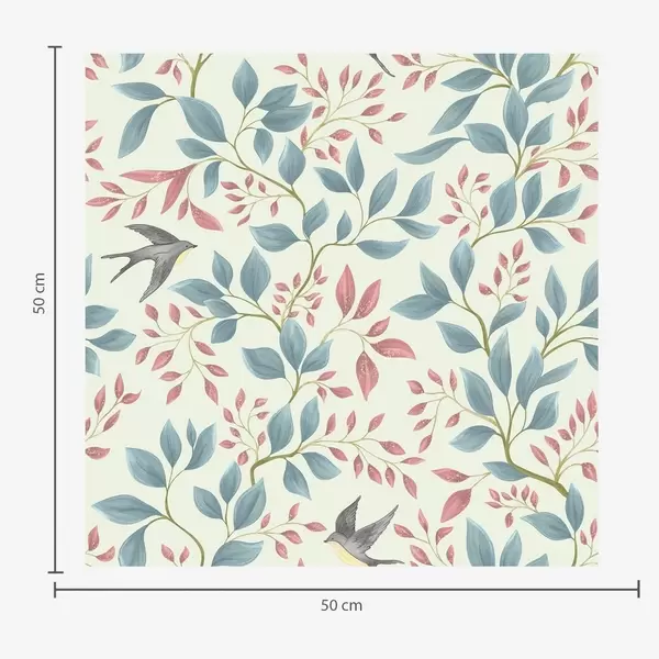 Carta da parati Rami blu e rosa con uccellini su sfondo color crema Nr. a00933