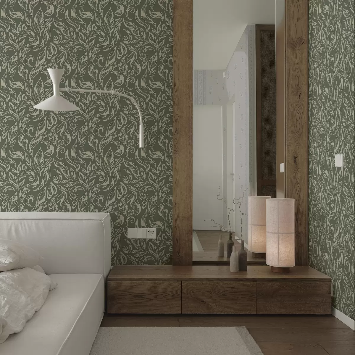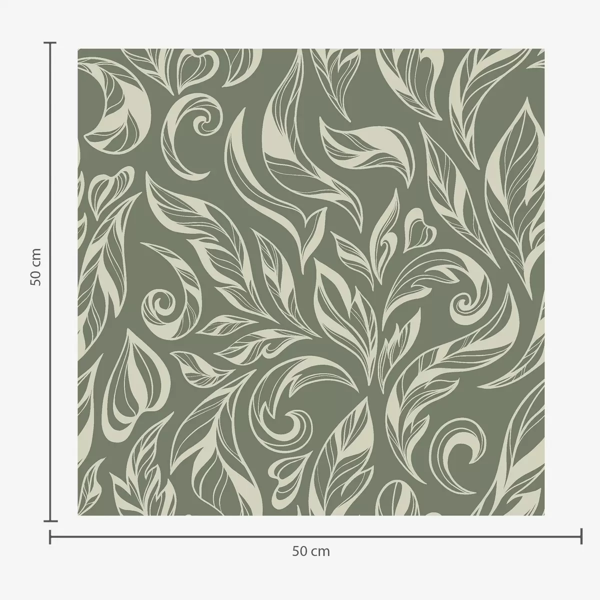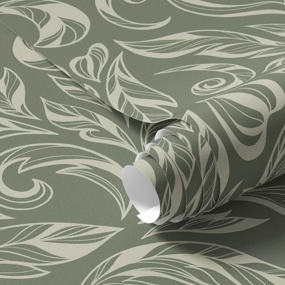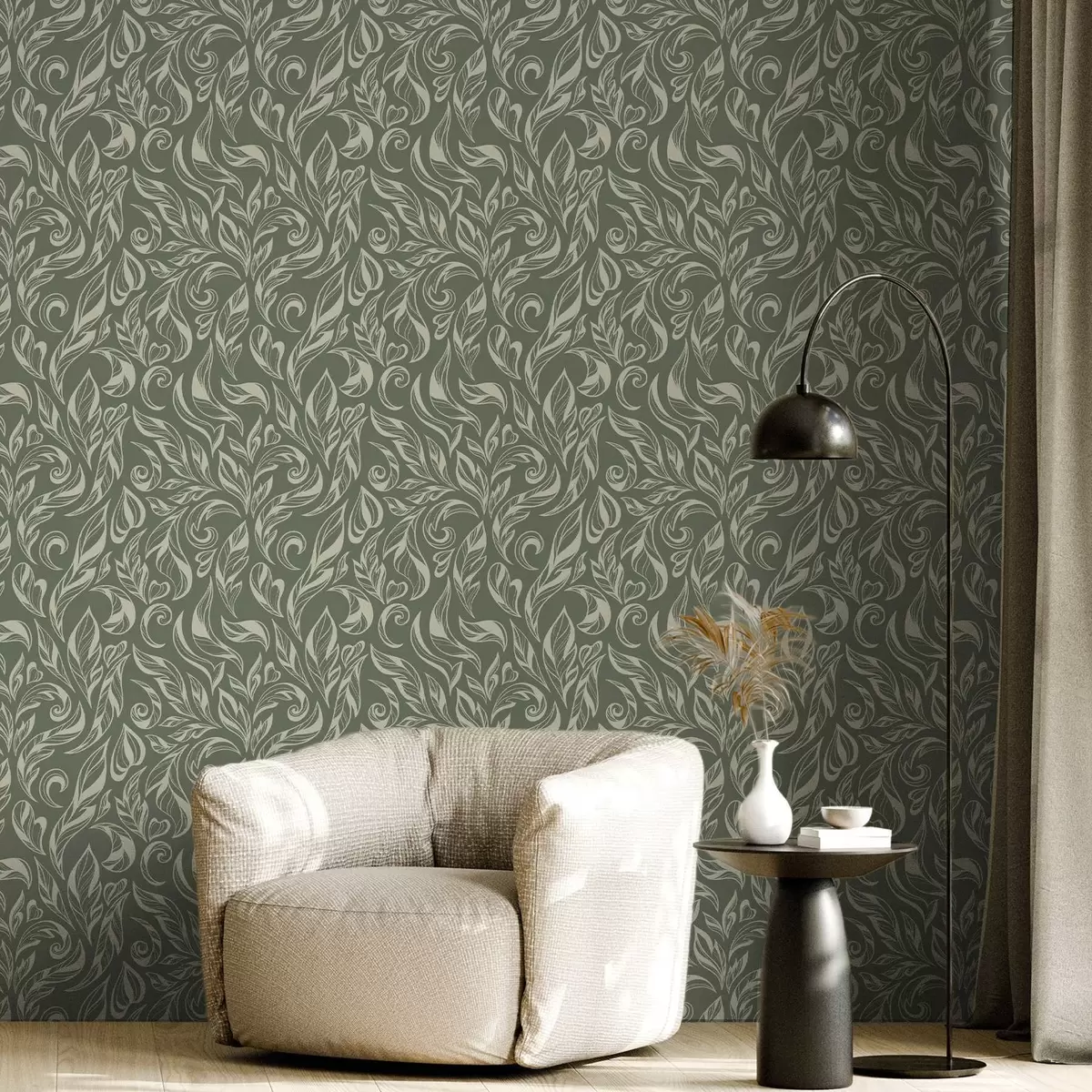 Carta da parati Ornamento a foglie color crema su sfondo grigio-verdastro Nr. a00940v2