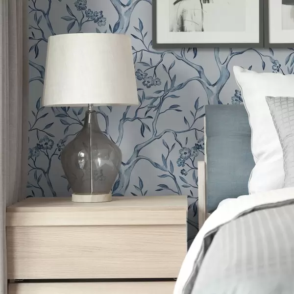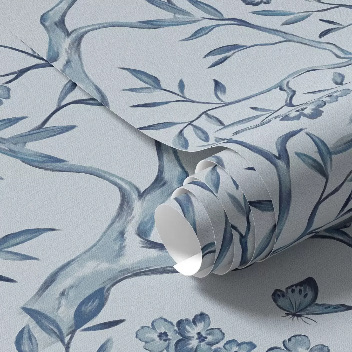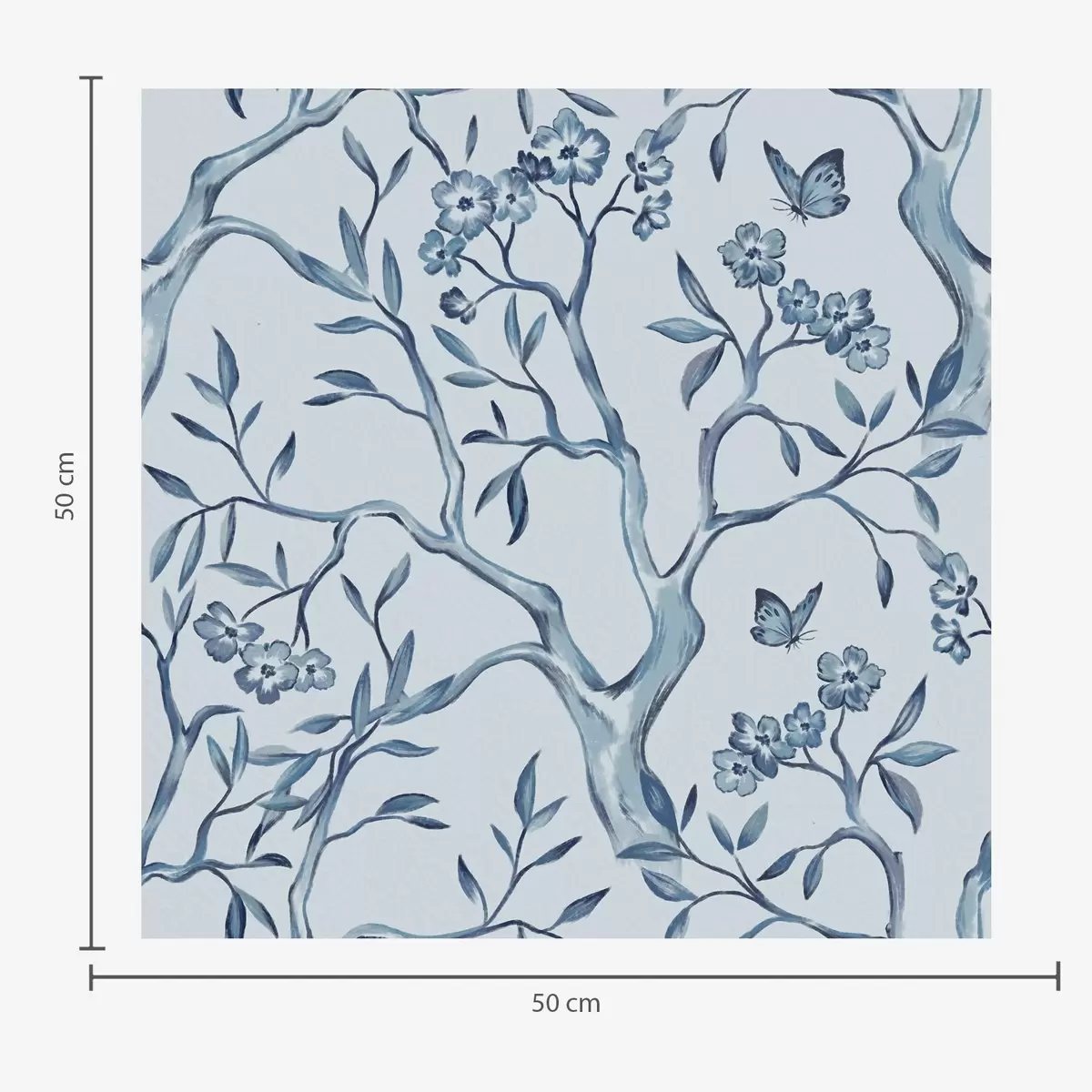 Carta da parati Rami blu acquerellati con fiori e farfalle su sfondo chiaro Nr. a00951