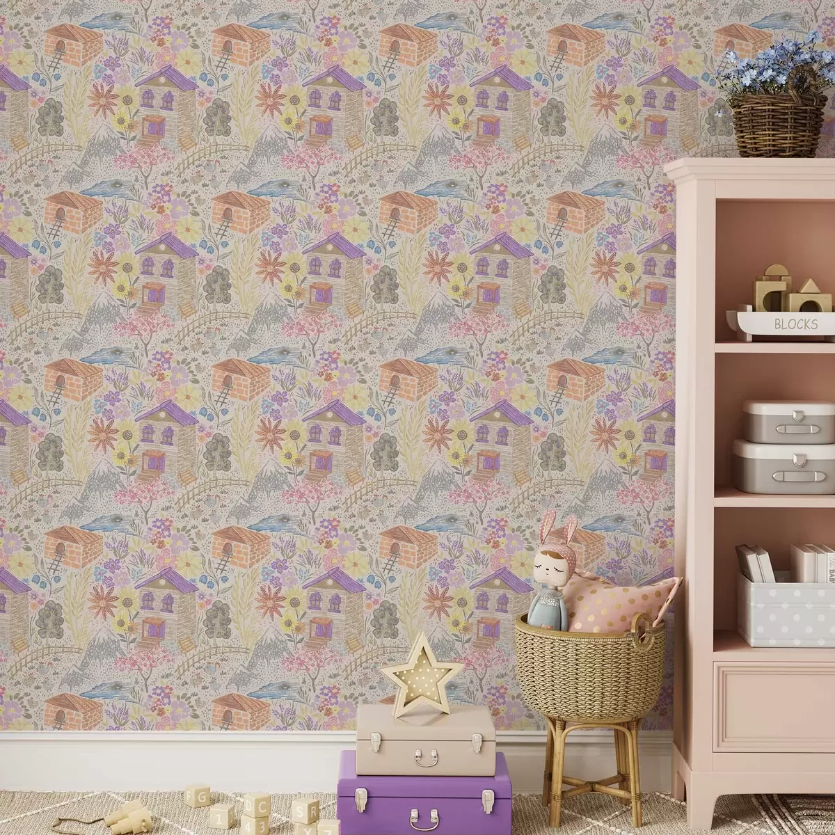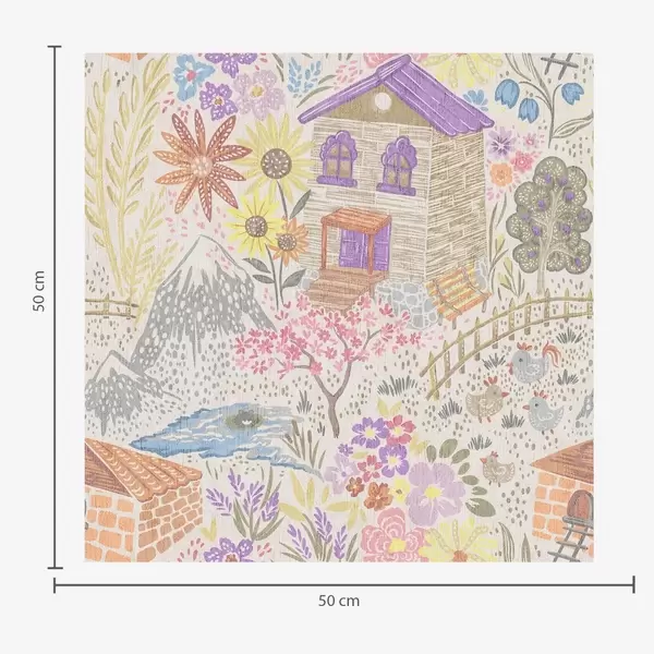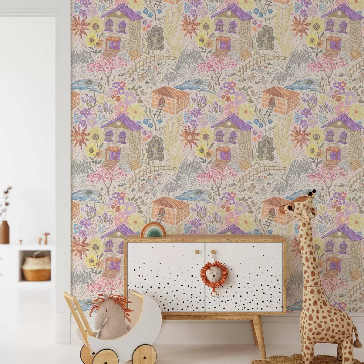 Carta da parati Disegno infantile di un villaggio con una casa, montagne e fiori Nr. a00952