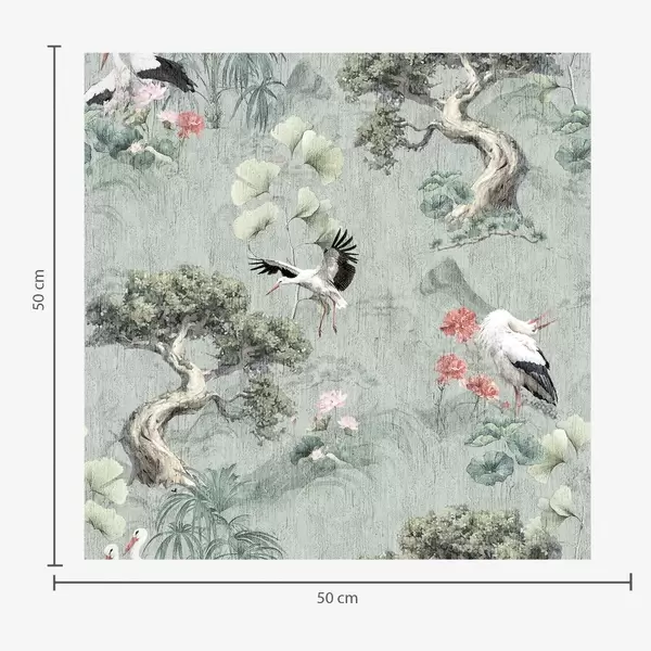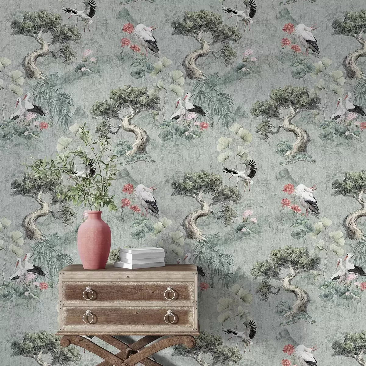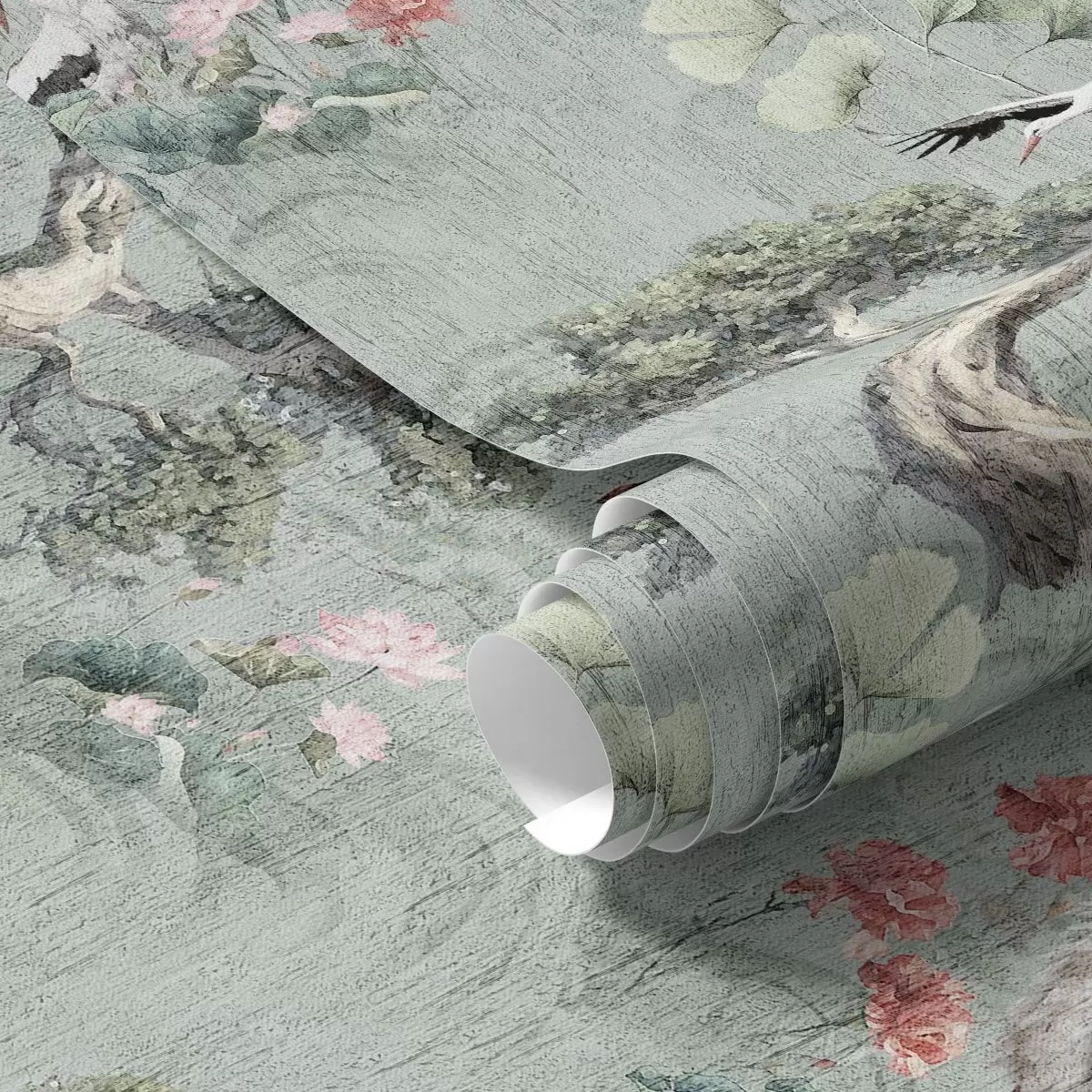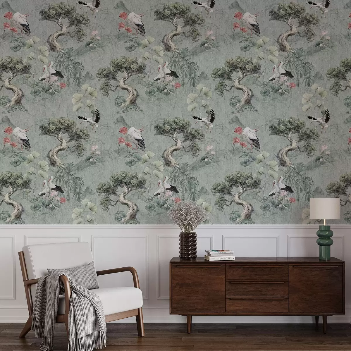 Carta da parati Gru tra pini e fiori di loto su uno sfondo verde tranquillo Nr. a00962