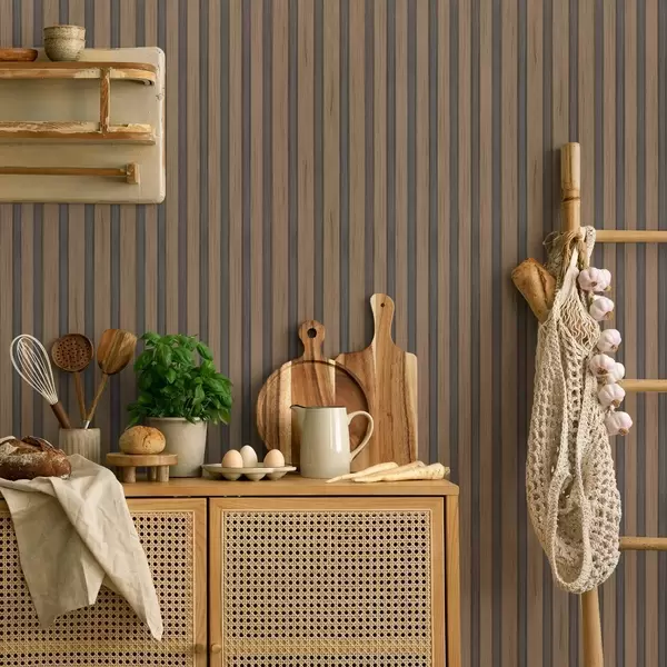 Carta da parati Lamelle verticali in legno con inserti grigio scuro a00991