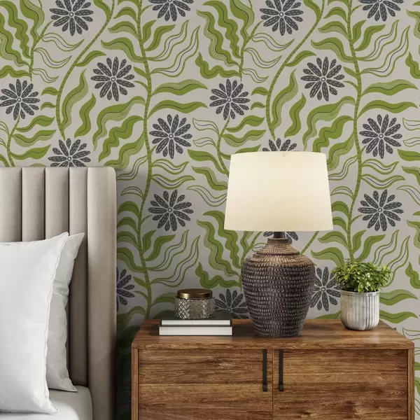 Carta da parati Giocose margherite verdi con foglie ondulate su sfondo color crema Nr. a00998