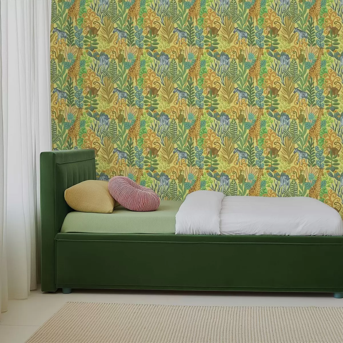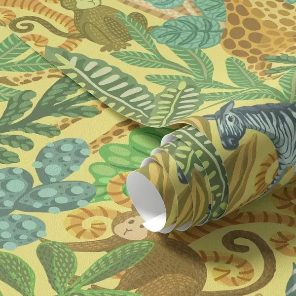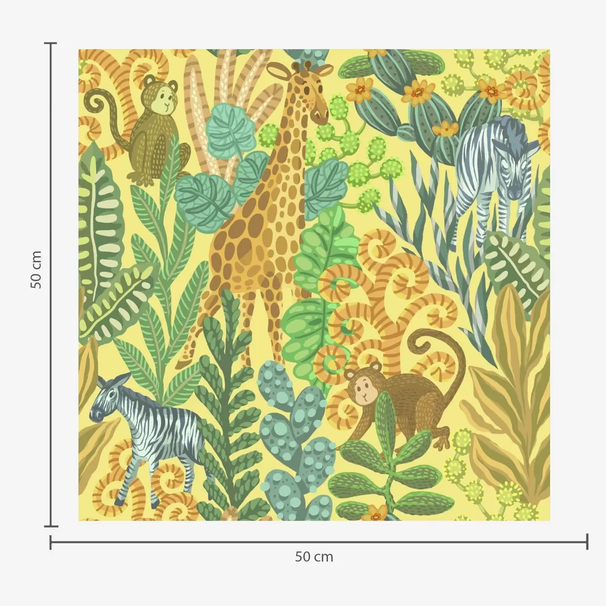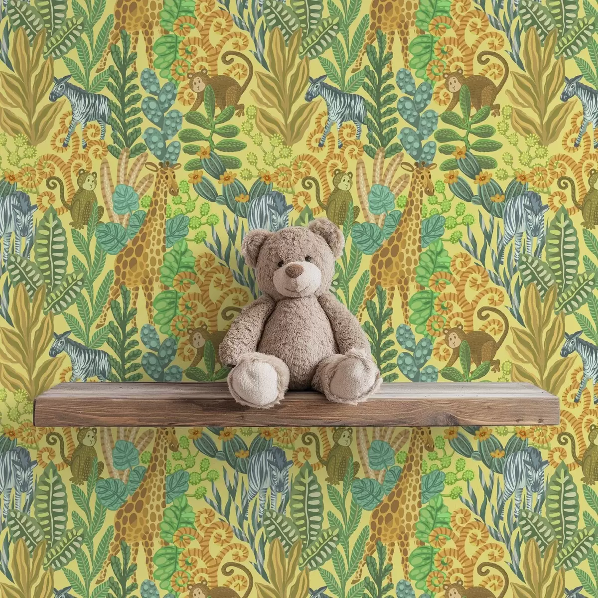 Carta da parati Giraffa, zebra e scimmia in una savana giallo brillante Nr. a01000v1