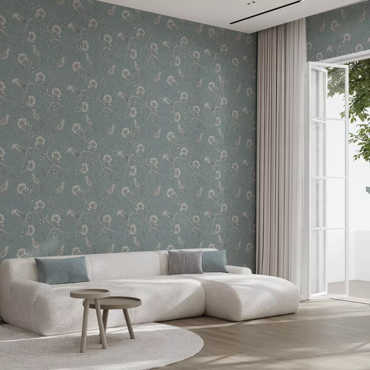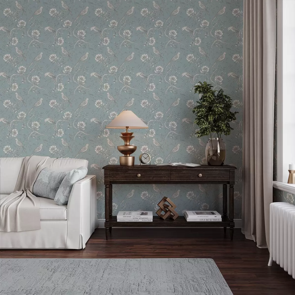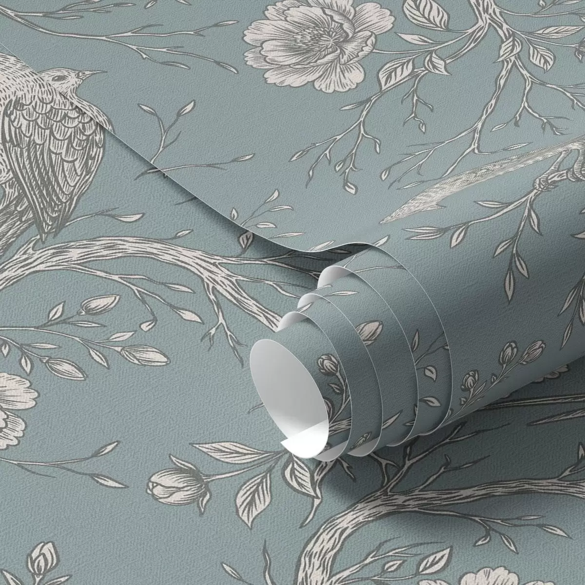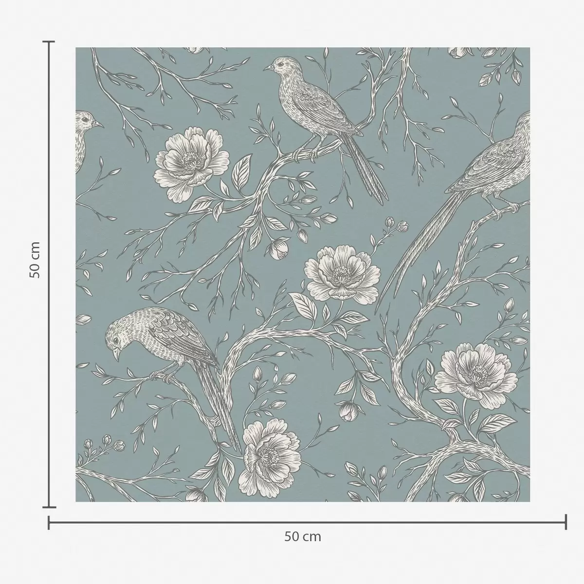 Carta da parati Uccelli disegnati in rilievo su rami, sfondo blu tenue Nr. a01022