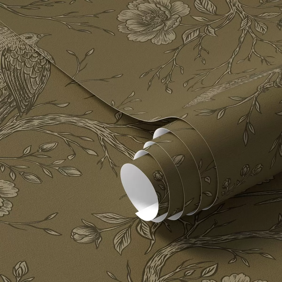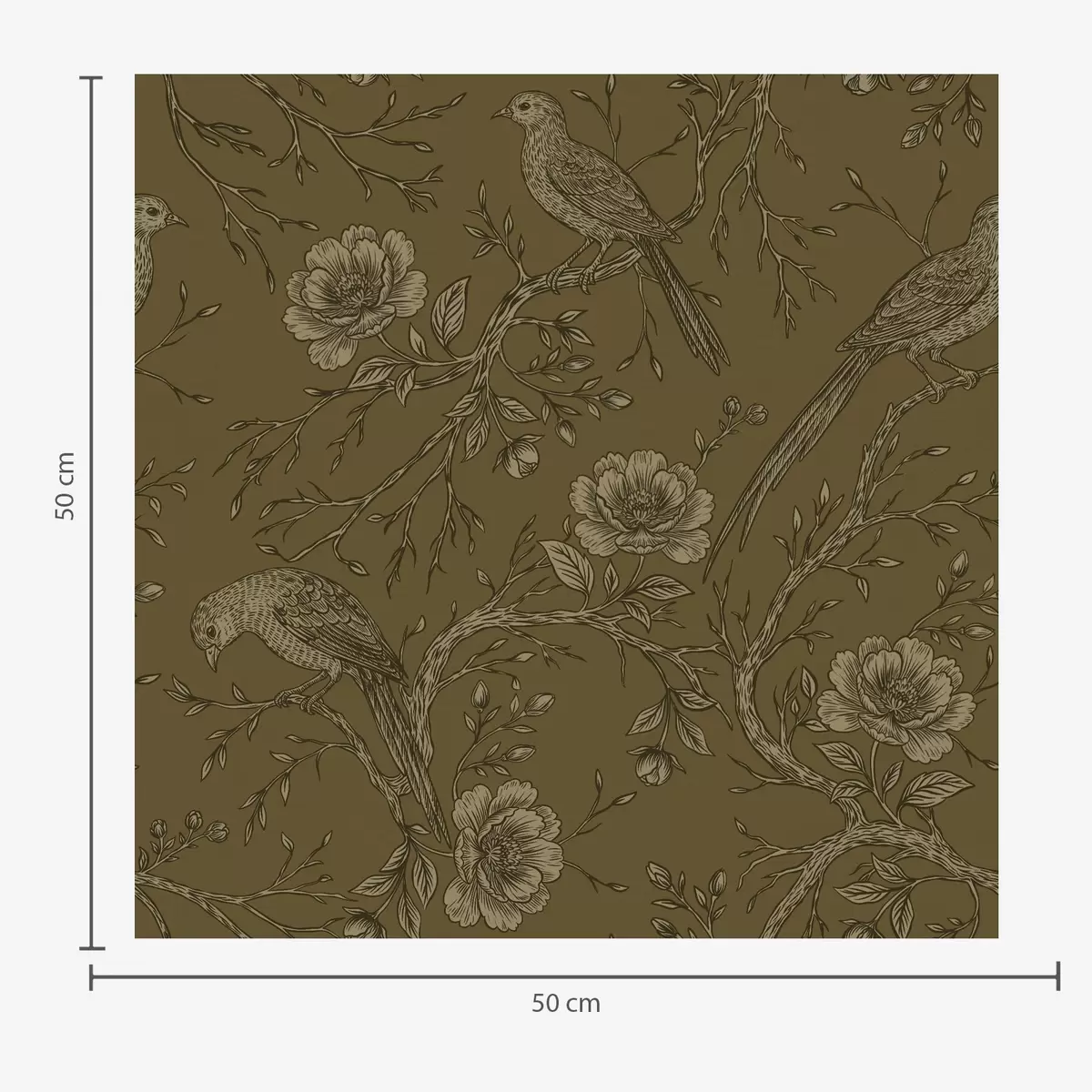 Carta da parati Uccelli e fiori vintage su uno sfondo color oliva caldo Nr. a01022v1