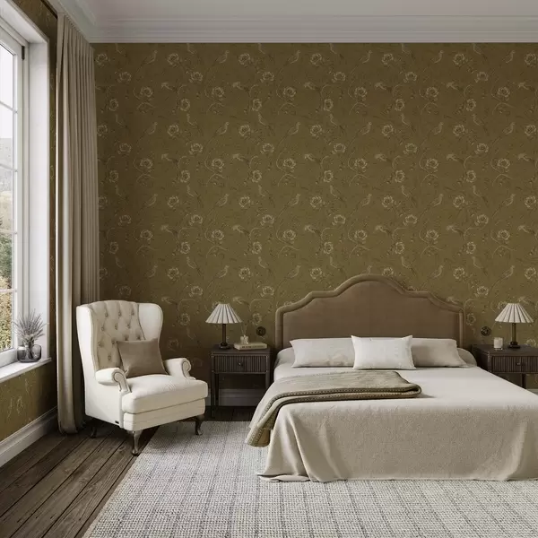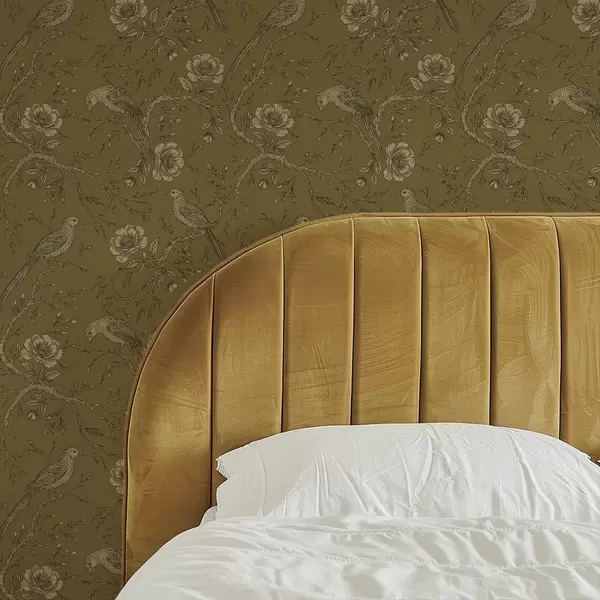 Carta da parati Uccelli e fiori vintage su uno sfondo color oliva caldo Nr. a01022v1